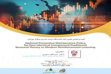 گروه و انجمن علمی دانشجویی آمار جلسه سخنرانی علمی با موضوع  Optimal Preventive Maintenace Policy for Non-identical Component با سخنرانی دکتر عبدالله صفری عضو هیأت علمی دانشگاه تهران را روز شنبه ۲۹ اردیبهشت ماه جاری از ساعت ۱۵ تا ۱۷ در سالن سمینار دانشکده علوم ریاضی (۳۴۰۱) برگزار می‌کند.