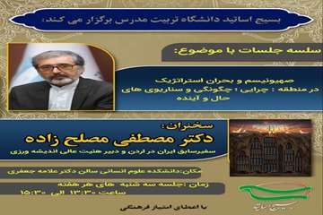 سلسله جلسات با موضوع «صهیونیسم و بحران استراتژیک در منطقه: چرایی، چگونگی و سناریوهای حال و آینده» با تاکید بر موقعیت ژئوپلیتیک و نظامی دو طرف نبرد، استراتژی دو طرف، فرایند تحول در گذشته و حال و آینده سه شنبه های هر هفته ساعت ۱۳:۳۰ تا۱۵:۳۰ در سالن علامه جعفری (دانشکده علوم انسانی) برگزار میشود.