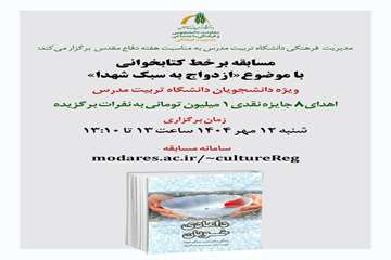مدیریت فرهنگی دانشگاه تربیت مدرس به مناسبت هفته دفاع مقدس مسابقه کتابخوانی با محوریت کتاب صوتی «دامادی خوبان؛ زندگی مشترک به سبک شهدا» ویژه دانشجویان را به صورت برخط از طریق سامانه مسابقات فرهنگی دانشگاه برگزار می‌کند و به ۸ نفر از برگزیدگان جایزه نقدی ۱ میلیون تومانی اهدا خواهد کرد.این مسابقه در روز شنبه ۱۲ مهر ۱۴۰۴ ساعت ۱۳ به مدت 10 دقیقه برگزار می‌شود.متقاضیان می‌توانند کتاب صوتی مسابقه را از آدرس پیوست خبر دریافت نمایند.