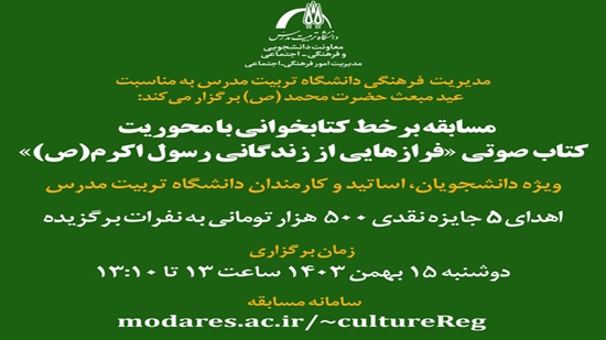 مدیریت فرهنگی دانشگاه تربیت مدرس به مناسبت فرا رسیدن عید مبعث حضرت محمد (ص) مسابقه کتابخوانی با محوریت کتاب صوتی « فرازهایی از زندگانی رسول اکرم (ص) » را به صورت برخط از طریق سامانه مسابقات فرهنگی دانشگاه برگزار می‌ کند. به ۵ نفر از برگزیدگان جایزه نقدی ۵۰۰ هزار تومانی اهدا خواهد کرد. زمان برگزاری مسابقه روز دوشنبه ۱۵ بهمن ۱۴۰۳ ساعت ۱۳ تا۱۳:۱۰ می‌باشد. دریافت کتاب صوتی « فرازهایی از زندگانی رسول اکرم (ص) » سامانه مسابقات فرهنگی دانشگاه تربیت مدرس