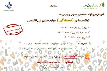 آموزشهای آزاد دانشگاه تربیت مدرس، دومین دوره توانمندسازی (بسندگی) مهارتهای زبان انگلیسی را با ظرفیت محدود برگزار میکند.