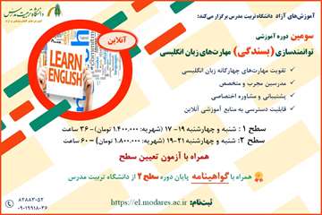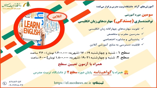 دفتر آموزش‌های آزاد دانشگاه تربیت مدرس، سومین دوره توانمندسازی مهارت‌های زبان انگلیسی (بسندگی) را برگزار می‌کند.