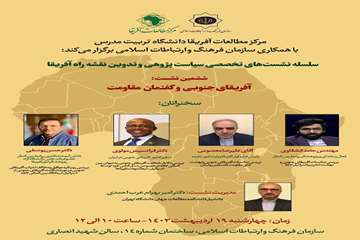 مرکز مطالعات آفریقای دانشگاه تربیت مدرس با همکاری سازمان فرهنگ و ارتباطات ششمین نشست از سلسله نشست های تخصصی « سیاست پژوهی و تدوین نقشه راه آفریقا» با عنوان : آفریقای‌جنوبی وگفتمان مقاومت را روز چهارشنبه 19 اردیبهشت ۱۴۰۳ برگزار می کند.
