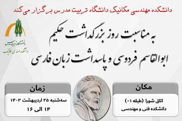 به مناسبت روز بزرگداشت حکیم ابوالقاسم فردوسی و پاسداشت زبان فارسی 25 اردیبهشت 1403 نشستی در دانشکده مهندسی مکانیک برگزار می شود.