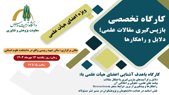 این کارگاه با سخنرانی دکتر روزبه عابدینی نسب و دکتر محمد ضابطیان طرقی روز یکشنبه 13 مهر 1404 ساعت 15تا 17 در سالن شهید رئیسی دانشکده‌ علوم انسانی برگزار می‌شود.در این کارگاه اعضای هیأت علمی با دلایل و فرآیندهای بازپس گیری یا ابطال مقالات، پیامدهای علمی حقوقی و اخلاقی آن، راهکارها و پیشگیری از بروز شرایط منجر به Retractionو نقش اساتید در هدایت دانشجویان و پژوهشگران در مسیر نشر مسئولانه آشنا می شوند.به شرکت کنندگان در کارگاه گواهی معتبر اعطا می‌شود.لینک ثبت نام