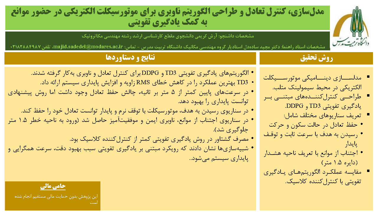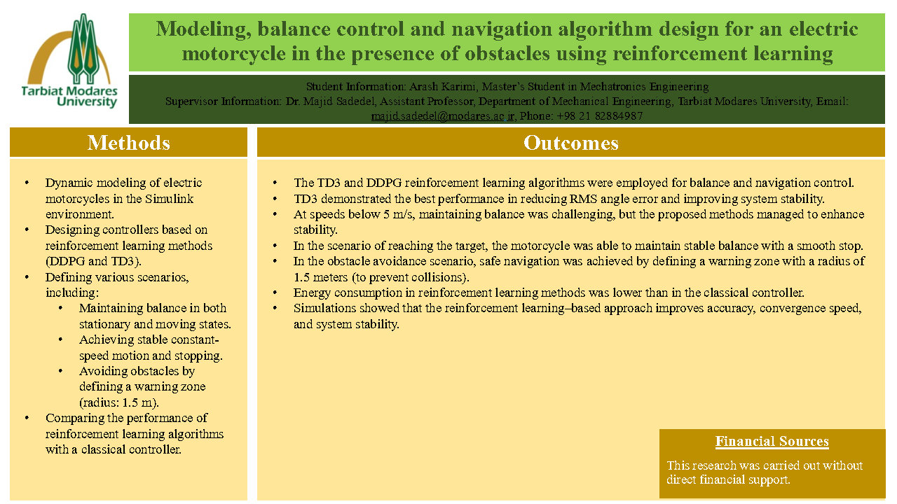 چکیده:خودروهای دوچرخ مانند موتورسیکلت و دوچرخه به دلیل ابعاد کوچک، اینرسی کمتر، مصرف انرژی پایین و قابلیت تغییر ناگهانی جهت حرکت نسبت به خودروهای چهارچرخ، در کاربردهایی که محدودیت فضا و نیاز به مانورپذیری بالا وجود دارد، گزینه‌ای ایده‌آل محسوب می‌شوند. تفاوت اساسی این وسایل با خودروهای چهارچرخ، نیاز به حفظ تعادل است که در سرعت‌های پایین، به‌ویژه کمتر از ۵ متر بر ثانیه، چالش‌برانگیزتر می‌گردد. این مسئله در شرایطی که مسیر دارای انحنای زیاد برای رسیدن به هدف باشد، دشواری بیشتری ایجاد می‌کند. در این پژوهش، موتورسیکلت الکتریکی بدون راننده و سرنشین مورد بررسی قرار گرفته است. در گام نخست، مدل‌سازی دینامیکی سیستم در محیط نرم‌افزار متلب انجام شده و در این مرحله عوامل محیطی و طبیعی نظیر باد، باران و شرایط جوی در نظر گرفته نشده‌اند. سپس کنترل چرخ عکس‌العمل با یک کنترل‌کننده تناسبی انتگرالی مشتقی طراحی گردید، به‌طوری‌که زاویه غلتش استخراج‌شده از سنسور به‌عنوان ورودی کنترلر دریافت و گشتاور تولیدی چرخ عکس‌العمل به‌عنوان خروجی آن اعمال شد. در ادامه، به‌منظور بهبود پایداری به‌ویژه در سرعت‌های پایین، الگوریتم یادگیری تقویتی برای بهینه‌سازی فرمان‌های کنترلی چرخ عکس‌العمل مورد استفاده قرار گرفت. علاوه بر حفظ تعادل، سناریوی ناوبری با الگوریتم رفتار مبنا از مبدأ به مقصد در حضور موانع نیز طراحی گردید. برای ارزیابی عملکرد سیستم، تست‌ها به‌صورت جداگانه با کنترل‌کننده تناسبی انتگرالی مشتقی و الگوریتم‌های یادگیری تقویتی انجام شد و نتایج شبیه‌سازی‌های به‌دست‌آمده با یکدیگر مقایسه گردید. در نهایت مشخص گردید که بهترین روش برای حفظ تعادل، استفاده از الگوریتم یادگیری تقویتی سه‌تایی تأخیری با مقدار خطای RMS برابر 1 درجه بوده است.