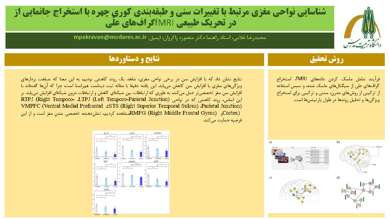 عنوان پایان نامه: شناسایی نواحی مغزی مرتبط با تغییرات سنی و طبقه‌بندی کوری چهره با استخراج جانمایی از گراف‌های علّی fMRI در تحریک طبیعی