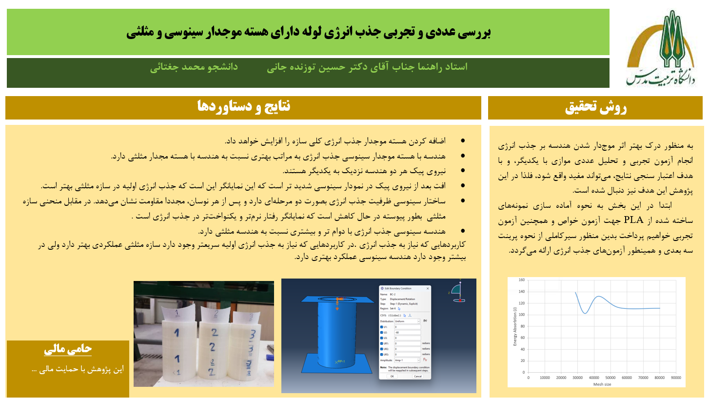 چکیده: بهبود ظرفیت جذب انرژی در سازه‌های سبک از موضوعات مهم در طراحی اجزای مهندسی برای صنایع مختلف از جمله هوافضا، خودروسازی و دریایی است. طراحی سازه‌هایی که بتوانند در عین داشتن وزن کم، انرژی ناشی از ضربه یا بارگذاری‌های ناگهانی را مستهلک سازند، می‌تواند نقش تعیین‌کننده‌ای در افزایش ایمنی و عملکرد آنها ایفا کند. یکی از روش‌های مؤثر برای دستیابی به این هدف، به‌کارگیری هسته‌های موج‌دار در ساختار لوله‌های استوانه‌ای است که به دلیل رفتار مکانیکی ویژه، قابلیت ایجاد تغییرشکل‌های پایدار و کنترل‌شده را دارند. در پژوهش حاضر، رفتار جذب انرژی لوله‌های استوانه‌ای تقویت‌شده با دو نوع هسته موج‌دار طولی، شامل هندسه سینوسی و هندسه مثلثی، به صورت عددی و تجربی مورد بررسی قرار گرفت. نمونه‌ها به روش ساخت افزایشی و از جنس پلی‌لاکتیک‌اسید (PLA) ساخته شدند.آزمایش‌های فشاری محوری روی نمونه‌ها انجام و نمودارهای نیرو–جابجایی به‌دست آمد. انرژی جذب‌شده از طریق محاسبه مساحت زیر این نمودارها با استفاده از روش ذوزنقه‌ای محاسبه گردید. به‌منظور اعتبارسنجی نتایج آزمایشگاهی، مدل‌سازی عددی با روش اجزای محدود در نرم‌افزار Abaqus انجام گرفت. شرایط بارگذاری مشابه آزمایش‌ها در مدل‌سازی اعمال و نتایج شبیه‌سازی با داده‌های تجربی مقایسه شد. این مقایسه نشان داد که میان دو مجموعه داده همخوانی مناسبی وجود دارد که نشان‌دهنده دقت مناسب مدل‌سازی عددی است. نتایج به‌دست‌آمده حاکی از آن است که نوع هندسه هسته تأثیر مستقیمی بر ظرفیت جذب انرژی دارد. در بین نمونه‌های ساخته‌شده، سازه با هسته سینوسی بیشترین میزان جذب انرژی ویژه معادل  J/g 2.591 را به خود اختصاص داد، در حالی که سازه با هسته مثلثی کمترین مقدار جذب انرژی ویژه معادل  J/g 1.897 را نشان داد.همچنین بررسی بارهای بیشینه ثبت‌شده نشان داد که بیشترین بار فشاری محوری برابر با KN 4.5 مربوط به سازه با هسته سینوسی بوده و کمترین بار فشاری محوری برابر با KN 3.5 در سازه با هسته مثلثی مشاهده شد. در مجموع، نتایج این تحقیق بیانگر آن است که تغییر در هندسه هسته موج‌دار می‌تواند به شکل قابل‌توجهی بر ظرفیت جذب انرژی لوله‌های استوانه‌ای تأثیر بگذارد. علاوه‌براین، همخوانی مناسب میان نتایج عددی و تجربی نشان می‌دهد که می‌توان از مدل‌سازی اجزای محدود به‌عنوان ابزاری کارآمد در پیش‌بینی رفتار این دسته از سازه‌ها استفاده نمود.