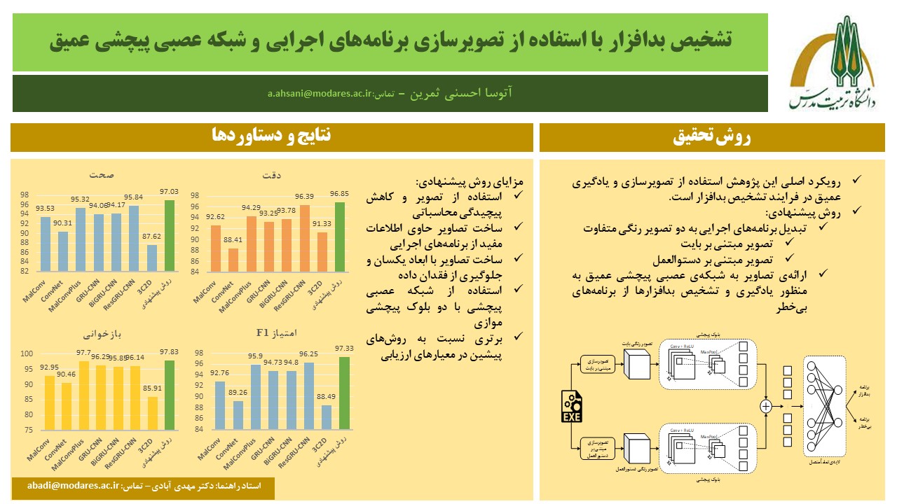چکیده: امروزه استفاده‌ ی گسترده از اینترنت منجر به افزایش تصاعدی حملات امنیت سایبری شده است. یکی از مهم‌ ترین تهدیدات، نرم‌ افزارهای مخرب یا همان بدافزارها هستند که با نفوذ به سیستم قربانی خسارت‌ هایی به بار می‌ آورند. بدافزارها روزبه‌ روز پیچیده‌ تر شده و تعداد آن‌ ها در حال افزایش است. ازآنجایی‌ که روش‌ های موجود برای شناسایی بدافزار اغلب قادر به همگامی با تغییرات بدافزارها نیستند، نیاز به روش‌ های قوی تشخیص بدافزار مطرح می‌ شود. در این پژوهش قصد بر معرفی روشی برای تشخیص بدافزار است که از تصویرسازی برنامه‌ های اجرایی و یادگیری عمیق به این منظور بهره می‌ برد. تصویرسازی برنامه‌ های اجرایی به‌ عنوان یک ابزار ارزشمند در تجزیه‌ و‌ تحلیل، درک و به‌ تصویرکشیدن رفتار بدافزار عمل می‌ کند. به‌ این‌ ترتیب هر برنامه‌ ی اجرایی با استفاده از روش درهم‌ سازی حساس به مکان Simhash به دو تصویر سه‌ کاناله رنگی، یکی مستخرج از اطلاعات بایت‌ های خام برنامه و دیگری مستخرج از اطلاعات دستورالعمل‌ های برنامه، تبدیل می‌ شود. به‌ طوری‌ که تصاویر حاصل از برنامه‌ های اجرایی با رفتار مشابه، به هم شباهت دارند. در ادامه برای یادگیری الگوهای رفتاری برنامه‌ های اجرایی که اکنون در قالب تصویر به نمایش گذاشته شده است، از شبکه‌ ی عصبی پیچشی بهره می‌ بریم. شبکه‌ ی عصبی پیچشی قادر است با یادگیری الگوهای مشابه از روی تصاویر، آن‌ هایی که به یکدیگر شباهت دارند را تشخیص دهد. به‌ این‌ ترتیب به‌ منظور یادگیری تصاویر تولیدشده در مرحله‌ ی قبل، یک شبکه‌ ی عصبی مبتنی بر شبکه عصبی پیچشی طراحی شد که در معماری آن از دو بلوک موازی پیچشی استفاده شده است. به‌ طوری‌ که هر بلوک بر روی جنبه‌ ی متفاوتی از رفتار برنامه‌ های اجرایی تمرکز دارد. تصاویر تولیدشده توسط این شبکه‌ ی عصبی پیچشی مورد یادگیری واقع می‌ شوند تا شبکه‌ ی عصبی بتواند بدافزارها را از برنامه‌ های اجرایی بی‌ خطر تشخیص دهد. روش پیشنهادی در این پژوهش پیاده‌ سازی شده و موردارزیابی قرار گرفت. نتایج حاصل، نشان می‌ دهد که این روش با دستیابی به صحت تشخیص بیشتر از ۹۷٪، عملکرد بهتری در مقایسه با روش‌ های پیشین دارد. به‌ علاوه در این پژوهش با تبدیل برنامه‌ های اجرایی به تصویر، زمان و منابع موردنیاز برای عملیات یادگیری شبکه‌ ی عصبی کاهش یافته است.