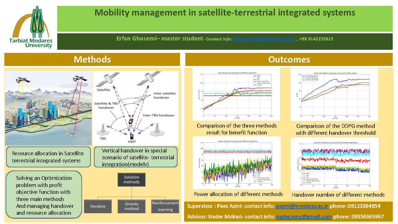 چکیده: در دهه‌ های اخیر، نیاز به ارتباطات با پهنای باند بالا و دسترسی به خدمات اینترنتی به‌ ویژه در مناطق دورافتاده و کم‌ تراکم، به‌ طور چشم‌ گیری افزایش یافته است. با وجود زیرساخت‌ های کافی در بسیاری از مناطق شهری، مناطق دورافتاده همچنان به پوشش گسترده‌ تری نیاز دارند که از توان شبکه‌ های زمینی به تنهایی خارج است. در این راستا، شبکه‌ های یکپارچه زمینی-ماهواره‌ ای به عنوان راهکاری موثر برای ارائه پوشش پایدار در نسل‌ های جدید ارتباطات مانند ۵Gو ۶G شناخته می‌ شوند. این پژوهش یک سناریوی نوین برای ادغام شبکه‌ های زمینی و ماهواره‌ ای با تمرکز بر مدیریت تحویل و تخصیص منابع ارائه می‌ دهد و نقش سود حاصل از بهینه‌ سازی در این ساختار را بررسی می‌ کند. یکپارچه‌ سازی این دو شبکه، چالش‌ های پیچیده‌ ای در مدیریت تحویل و تخصیص منابع ایجاد می‌ کند. حرکت مداوم ماهواره‌ ها نیازمند تغییرات مکرر اتصال کاربران است که مدیریت تحویل را حیاتی می‌ کند. این پژوهش به مدل‌ سازی بهینه تحویل و تخصیص منابع در شبکه‌ های یکپارچه می‌ پردازد. مدل پیشنهادی با استفاده از الگوریتم‌ های یادگیری تقویتی، با تمرکز بر بهینه‌ سازی سود و تخصیص منابع، به بهبود عملکرد این شبکه‌ ها کمک می‌ کند. نتایج شبیه‌ سازی‌ ها نشان می‌ دهند که روش یادگیری تقویتی، بهره‌ وری سیستم را در مقایسه با روش‌ های دیگر افزایش می‌ دهد. این پژوهش مدل جدیدی با استفاده از یادگیری تقویتی برای بهینه‌ سازی تخصیص منابع و مدیریت تحویل ارائه می‌ دهد. مدل پیشنهادی توانایی تطبیق‌ پذیری بالایی دارد و می‌ تواند در شرایط متغیر شبکه تخصیص بهینه‌ ای برای منابع فراهم کند. نتایج مقایسه‌ ای با روش‌ های موجود نشان می‌ دهد که روش پیشنهادی عملکرد بهتری در کاهش تحویل‌ ها و افزایش سود شبکه دارد. این بهبود در تخصیص منابع و مدیریت تحویل، به کاهش هزینه‌ های عملیاتی شبکه‌ های یکپارچه ماهواره‌ ای-زمینی و افزایش سود حاصل از برقرای ارتباط کمک می‌ کند. نتایج شبیه‌ سازی‌ ها نشان می‌ دهند که مدل پیشنهادی می‌ تواند بهبود قابل‌ توجهی در تعادل بار شبکه و پیوستگی ارتباطات در سناریوهای مختلف ایجاد کند.