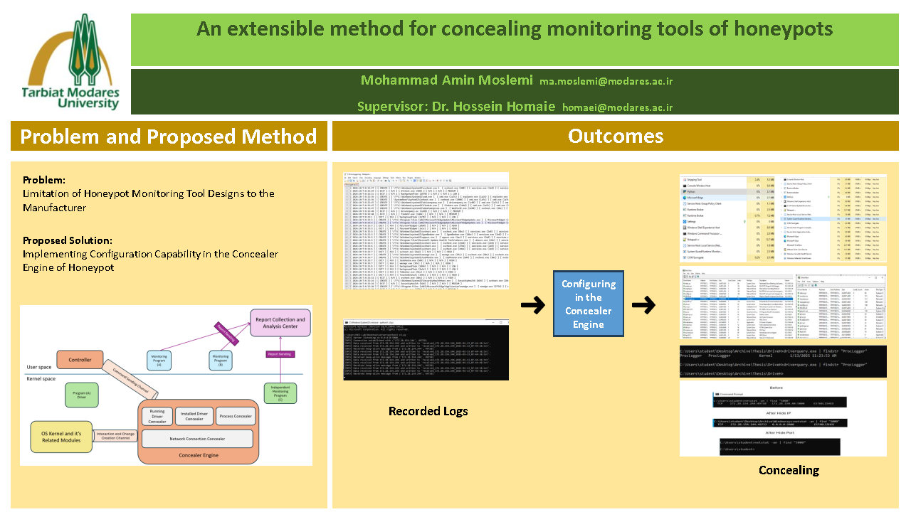 چکیده: در سال‌ های اخیر، گسترش بدافزارها و حملات روز صفر به عنوان یکی از مهم‌ ترین تهدیدات سایبری شناخته شده است. طبق گزارش‌ های اخیر، زمان شناسایی و بهره‌ برداری از آسیب‌ پذیری‌ ها به شدت کاهش یافته و اسکنرهای خودکار قادر به شناسایی سامانه‌ های آسیب‌ پذیر در مدت کوتاهی پس از افشای آسیب‌ پذیری هستند. این امر ضرورت به‌ کارگیری روش‌ های پیشرفته برای شناسایی و مقابله با تهدیدات را بیشتر کرده است. تله‌ های عسل به عنوان ابزاری برای فریب مهاجمان و جمع‌ آوری اطلاعات درباره حملات سایبری نقش مهمی در این زمینه ایفا می‌ کنند. این ابزارها با شبیه‌ سازی سامانه‌ های واقعی، مهاجمان را به سمت خود جذب کرده و از فعالیت‌ های آن‌ ها اطلاعات جمع‌ آوری می‌ کنند. با این حال، تله‌ های عسل سنتی دارای محدودیت‌ هایی هستند که می‌ تواند عملکرد آن‌ ها را در شناسایی و مقابله با تهدیدات پیچیده کاهش دهد. به طور خاص، یکی از چالش‌ های مهم در این زمینه آن است که مهاجم پس از ورود به تله عسل، متوجه تله شده و به سرعت از آن خارج شود. برای مقابله با این چالش، لازم است ابزارهای نظارتی موجود در تله عسل را به گونه‌ ای پنهان کنیم که از دید مهاجم مخفی بمانند. در این پژوهش، رویکردی جدید برای بهبود قابلیت پنهان‌ سازی تله‌ های عسل ارائه شده است. به این منظور، از تکنیک‌ های پیشرفته نظیر DKOM و   IRP Hookingبرای پنهان‌ سازی فرآیندها، درایورها و ارتباطات شبکه استفاده شده است. تکنیک DKOM امکان تغییر مستقیم در ساختار داده‌ های هسته سامانه را فراهم می‌ کند، به‌ طوری که فرآیندها و فعالیت‌ های مرتبط به سختی شناسایی می‌ شوند. IRP Hooking نیز با مدیریت و تغییر مسیر درخواست‌ های ورودی و خروجی، ارتباطات شبکه را از دید مهاجم پنهان می‌ سازد. این پژوهش به بررسی چالش‌ های موجود در پیاده‌ سازی این تکنیک‌ ها در سامانه‌ های مدرن پرداخته و راهکارهایی برای غلبه بر محدودیت‌ های امنیتی نظیر Patch Guard و DSE ارائه می‌ کند. همچنین با استفاده ازIRP Hooking   بر روی درایور NSI، سامانه‌ ای برای ارسال مخفیانه اطلاعات ثبت‌ شده از فعالیت‌ های مهاجم به سامانه مرکزی طراحی شده است که بدون جلب توجه مهاجم قابل استفاده است. روش پیشنهادی با موفقیت در سیستم‌ عامل ویندوز ۱۰ پیاده‌ سازی شده است. ارزیابی‌ های صورت گرفته نشان می‌ دهد که روش پیشنهادی در شناسایی و جمع‌ آوری اطلاعات از مهاجمان عملکرد بهتری نسبت به روش‌ های پیشین دارد و می‌ تواند در محیط‌ های عملیاتی واقعی به‌ کار گرفته شود. طراحی کاربردی این سامانه، امکان پیاده‌ سازی و استفاده سریع را فراهم کرده و کارایی آن را در مقابله با تهدیدات سایبری افزایش می‌ دهد