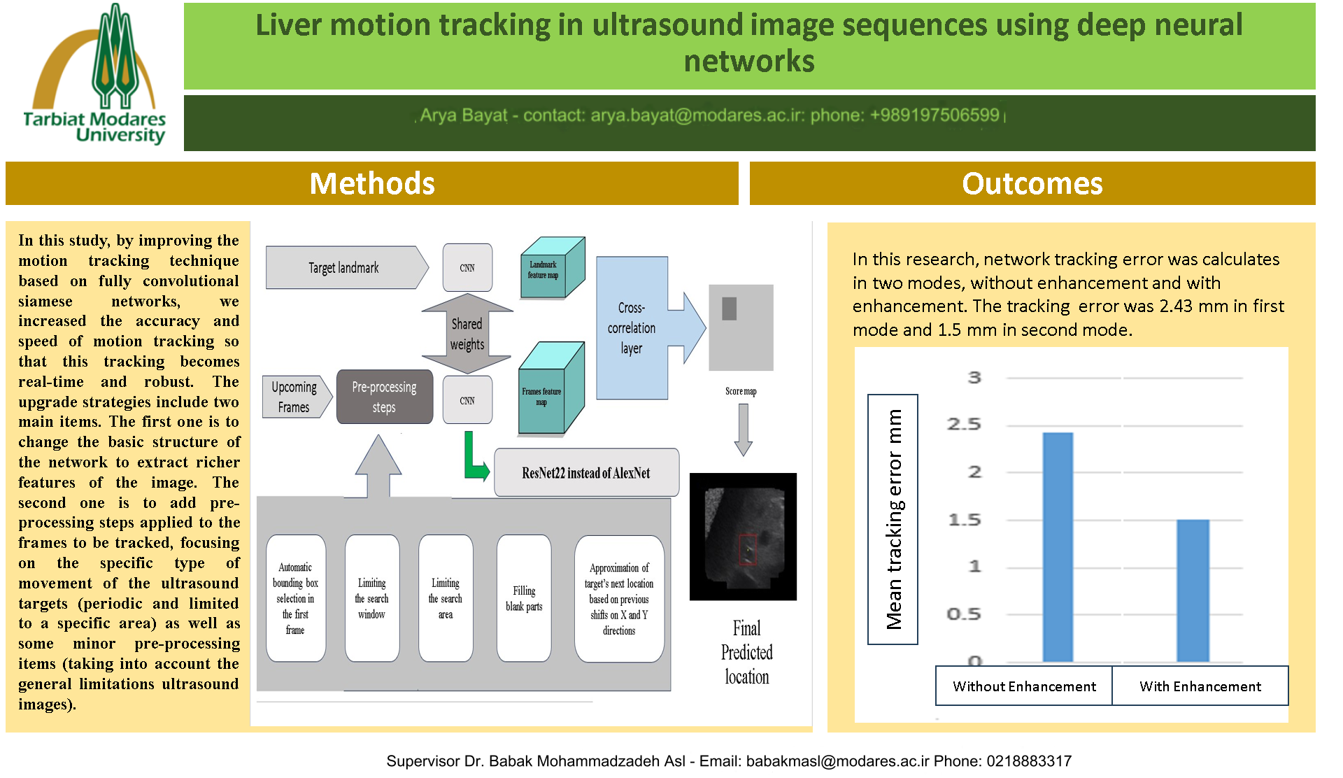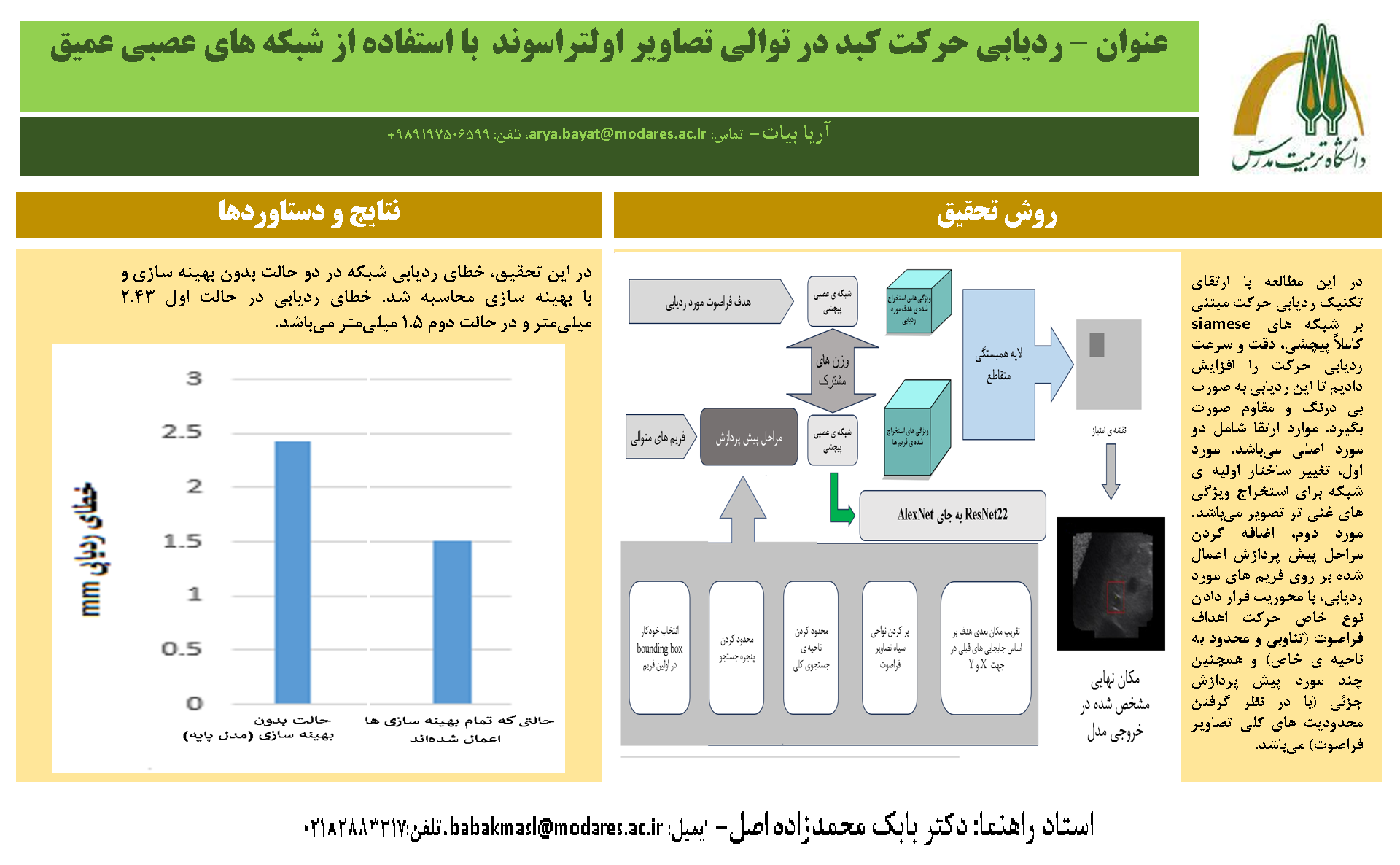 چکیده: ردیابی حرکت طیف وسیعی از کاربردها در تصویربرداری فراصوت دارد. از ردیابی حرکت در چندین کاربرد مانند تصویربرداری الاستیسیته، تصویربرداری جریان خون، الاستوگرافی، ردیابی لکه‌های فوتو آکوستیک، تصحیح انحراف فاز، و اکوکاردیوگرافی  استفاده می‌شود. از پرکاربرد‌ترین روش‌ های سنتی برای ردیابی حرکت در تصاویر فراصوت، ردیابی حرکت مبتنی بر تطبیق بلوک است، که در آن یک استراتژی جستجوی جامع  برای تطبیق بلوک مرجع با بلوک‌ های هم اندازه در فریم‌ های تصویر متوالی استفاده می‌ شود. این روش در تحقیقات مختلف به طور کامل مورد مطالعه قرار گرفته‌ اند و از نظر بار محاسباتی سنگین و کند هستند. در نتیجه، این روش‌ها برای پردازش بی‌ درنگ مناسب نیستند. اخیراً الگوریتم‌ های ردیابی مبتنی بر یادگیری عمیق مانند شبکه‌ های عصبی siamese در حوزه تصویربرداری پزشکی مورد توجه قرار گرفته‌ اند. شبکه‌های siamese از یک شبکه عصبی پیچشی برای یادگیری یک نمایش کارآمد و مقاوم  (نسبت به تغییر اندازه و ظاهر هدف مورد ردیابی) از ناحیهٔ موردنظر استفاده می‌کنند که باید ردیابی شود. مزیت اصلی استفاده از این شبکه‌ها این است که از نظر محاسباتی بسیار کارآمد هستند زیرا ردیابی فقط در نواحی اطراف مکان قبلی هدف و با یک رویکرد شباهت سنجی ساده صورت می‌ گیرد. همچنین به دلیل رویکرد شباهت سنجی این شبکه ها، تعمیم پذیری خوبی در ردیابی سایر اهداف دیده نشده دارند. در این مطالعه با ارتقای تکنیک ردیابی حرکت مبتنی بر شبکه‌های siamese کاملاً پیچشی، دقت و سرعت ردیابی حرکت را افزایش دادیم تا این ردیابی به صورت بی‌درنگ و مقاوم صورت بگیرد. موارد ارتقا شامل دو مورد اصلی می‌ باشد. مورد اول، تغییر ساختار اولیهٔ شبکه برای استخراج ویژگی‌های غنی‌تر تصویر می‌ باشد. مورد دوم، اضافه کردن مراحل پیش پردازش اعمال شده بر روی فریم‌های مورد ردیابی، با محوریت قرار دادن نوع خاص حرکت اهداف فراصوت (تناوبی و محدود به ناحیهٔ خاص) و همچنین چند مورد پیش پردازش جزئی (با در نظر گرفتن محدودیت‌های کلی تصاویر فراصوت) می‌ باشد. با توجه به آموزش ندیدن مجدد شبکه بر روی داده‌های آموزش، یک ارزیابی کمی بر روی این قسمت از داده‌ها انجام گرفت. این ارزیابی به دلیل در دسترس قرار نگرفتن ارزیابی کمی توسط سایت مرجع داده‌های clust توسط خودمان صورت گرفت. برای مقایسهٔ تاثیر بهینه سازی‌های انجام شده در این تحقیق، خطای ردیابی شبکه در دو حالت بدون بهینه سازی و با بهینه سازی محاسبه شد. خطای ردیابی در حالت اول ۲.۴۳ میلی‌ متر و در حالت دوم ۱.۵ میلی‌ متر می‌ باشد که تاثیر گذار بودن رویکرد‌های بهینه سازی علی رغم ساده بودن آن‌ها را نشان می‌ دهد.