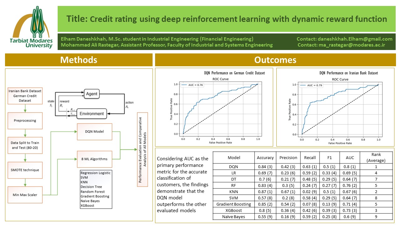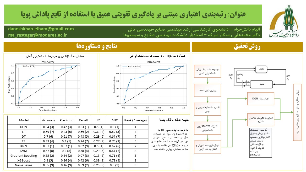 چکیده:امتیازدهی اعتباری نقشی حیاتی در ارزیابی قابلیت بازپرداخت افراد و شرکت‌ها دارد و به اعتباردهندگان کمک می‌کند تصمیمات قرض‌دهی خود را براساس اطلاعات معتبر اتخاذ کنند. در سال‌های اخیر، بهره‌برداری از تکنیک‌های یادگیری ماشین (Machine Learning) در امتیازدهی اعتباری به دلیل توانایی آنها در بهره‌گیری از مجموعه‌داده‌های بزرگ و تشخیص الگوهای پیچیده به شدت مورد توجه قرار گرفته است. در این پژوهش، از شبکه‌های Q عمیق به عنوان نوعی یادگیری تقویتی عمیق در ارزیابی ریسک اعتباری استفاده شده است و از نسبت‌های دقت برای هر کلاس به عنوان یک تابع پاداش پویا استفاده می‌کند. این چارچوب نوآورانه، روابط پیچیده داده‌های مالی را در بر می‌گیرد و مکانیزمی پویا و تطبیقی برای ارزیابی اعتبار ارائه می‌کند و در این راستا از مجموعه داده‌های اعتباری دنیای واقعی استفاده می‌کند. در این تحقیق با استفاده از داده‌های واقعی اعتباری یک بانک ایرانی، عملکرد مدل پیشنهادی با 8 الگوریتم یادگیری ماشین مقایسه شده است. همچنین مدل پیشنهادی بر روی مجموعه داده‌ی آلمان نیز اجرا شده است. نتایج این تحقیق نشان داد که مدل پیشنهادی یادگیری تقویتی عمیق مبتنی بر شبکه‌های عمیق (DQN) در تشخیص مشتریان خوش‌حساب و بدحساب نسبت به سایر مدل‌ها برتری دارد. همچنین نتایج حاکی از آن است که مدل DQN نه‌تنها از توانایی بالایی در یادگیری سیاست‌های تصمیم‌گیری بهینه برخوردار است، بلکه در مواجهه با داده‌های نامتوازن نیز از پایداری و تعمیم‌پذیری مناسبی برخوردار است. این پژوهش گام مؤثری در جهت تلفیق تکنیک‌های یادگیری تقویتی عمیق با مسائل مالی بوده و زمینه‌ساز توسعه مدل‌های هوشمندتر در حوزه ارزیابی ریسک اعتباری است.