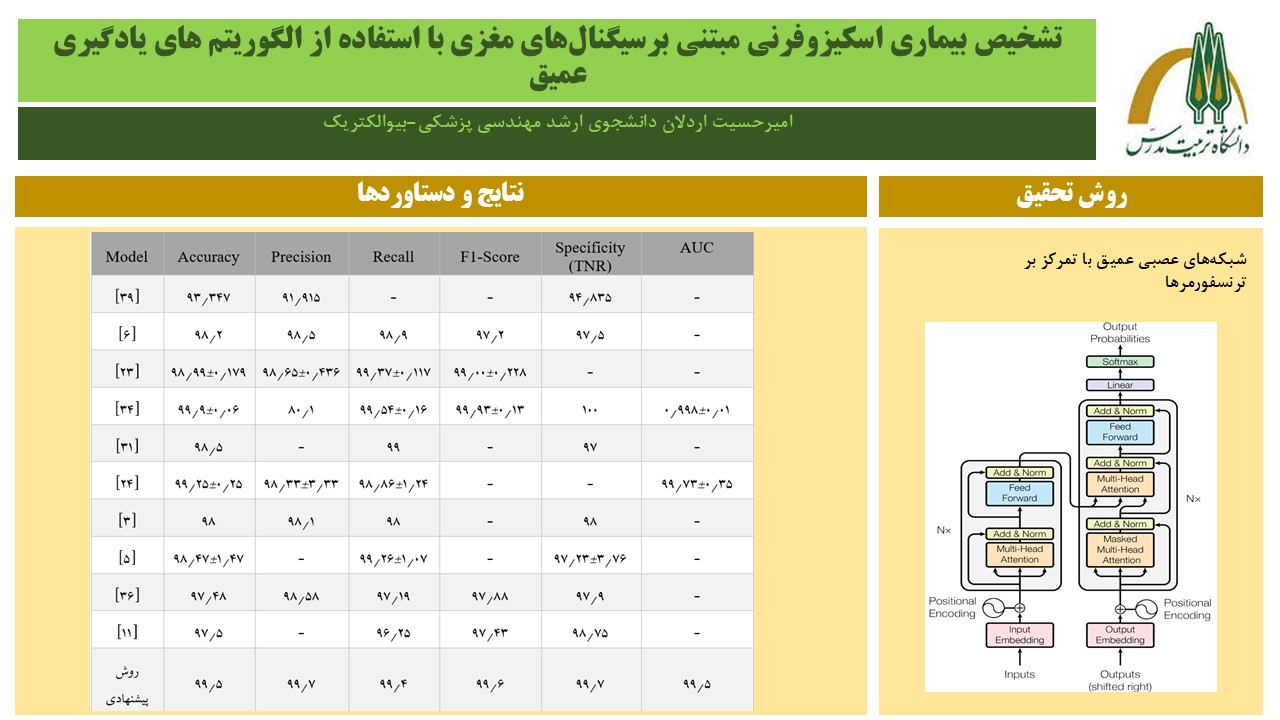 چکیده: اسکیزوفرنی یک اختلال روانی پیچیده و طولانی‌مدت است که با علائمی همچون هذیان، توهم، اختلال در گفتار، نارسایی‌های شناختی و تجربه ادراکات غیرواقعی همراه است و می‌تواند به ناتوانی مادام‌العمر منجر شود. این بیماری بر تفکر، رفتار و احساسات افراد تأثیرگذار بوده و به عنوان یکی از چالش‌های عمده سلامت روان شناخته می‌شود. تشخیص زودهنگام اسکیزوفرنی نقش مهمی در بهبود روند درمان و کیفیت زندگی بیماران ایفا می‌کند. با این حال، ماهیت پیچیده، متنوع و مبهم علائم این اختلال، فرآیند تشخیص را دشوار ساخته است. سیگنال‌های مغزی کم‌هزینه، غیرتهاجمی و با آنتروپی بالا هستند و بنابراین پتانسیل زیادی برای تشخیص بالینی بیماری‌های عصبی و کاربردهای رابط مغز و کامپیوتر دارد. بنابراین، تشخیص خودکار بیماری بر اساس سیگنال‌های مغزی مربوط به افراد سالم و بیماران اسکیزوفرنی می‌تواند به طور مؤثر به پزشکان در تشخیص دقیق کمک کند. در این پژوهش، رویکردی نوین مبتنی بر معماری ترنسفورمر برای تشخیص اسکیزوفرنی از سیگنال‌های مغزی ارائه می‌شود. فرآیند تحقیق شامل مراحل انتخاب داده، پیش‌پردازش، استخراج ویژگی و طبقه‌بندی است. برای شبیه‌سازی‌ها از مجموعه‌داده IBIB PAN-Department of Methods of Brain Imaging and Functional Research of Nervous System  استفاده شد. پیش‌پردازش داده‌ها شامل تحلیل مؤلفه‌های مستقل، فیلترگذاری، نرمال‌سازی و تقسیم سیگنال‌ها به پنجره‌های زمانی است. سپس معماری ترنسفورمر با استفاده از توابع فعال‌سازی مختلف برای استخراج ویژگی‌ها به کار گرفته می‌شود. برای ارزیابی عملکرد مدل پیشنهادی، از روش اعتبارسنجی متقابل K-Fold با 10 K= استفاده گردید. نتایج حاصل نشان داد که روش پیشنهادی قادر به دستیابی به حداکثر دقت 99.4، درستی 99.5، حساسیت 99.4، اختصاصیت 99.4 ، امتیازF1 99.5 و سطح زیر منحنی 0.994 دست یابد. ین نتایج بیانگر توان بالقوه روش پیشنهادی در بهبود فرآیند تشخیص بالینی اسکیزوفرنی و ارتقای کارایی سیستم‌های هوش مصنوعی در حوزه سلامت روان می‌باشد