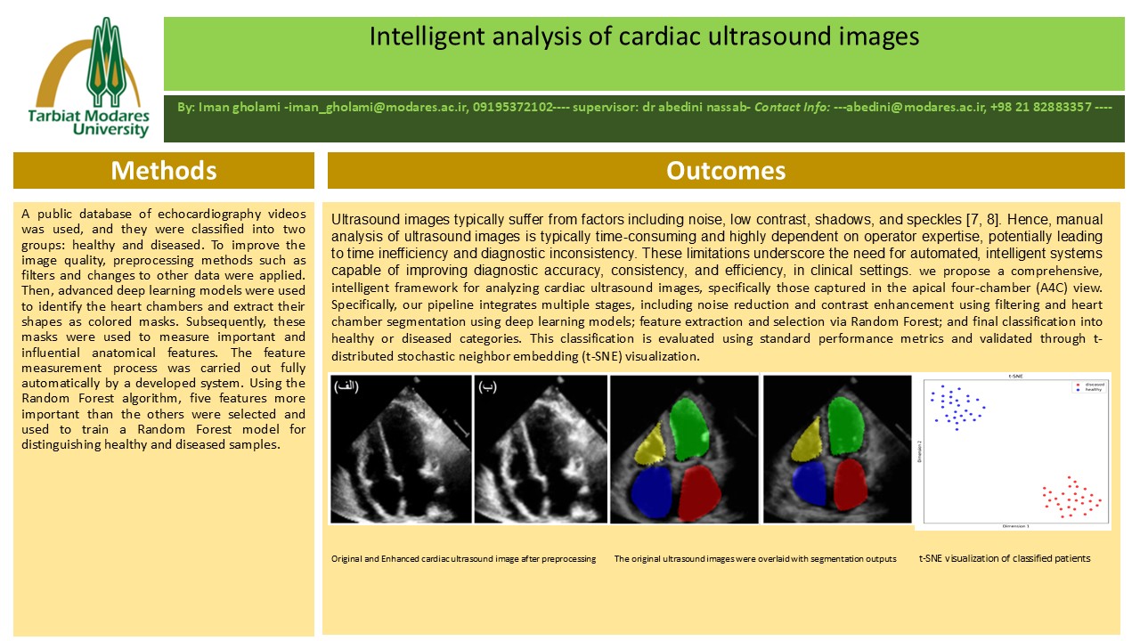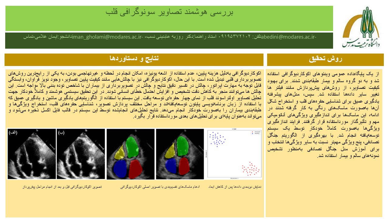 چکیده: بیماری‌های قلبی یکی از شایع‌ترین دلایل مرگ‌ومیر در جهان به شمار می‌روند و تشخیص به‌موقع آن‌ها می‌تواند نقش کلیدی در نجات جان بیماران داشته باشد. در این پژوهش، یک سیستم هوشمند برای تحلیل تصاویر اولتراسوند قلب از نمای چهار حفره‌ای به‌منظور ارزیابی سلامت قلب ارائه می‌دهد. برای پژوهش حاضر، از یک پایگاه‌داده عمومی شامل ویدئوهای اکوکاردیوگرافی استفاده شد. فریم‌های مربوط به مرحله دیاستول از این ویدئو ها استخراج شد و طبق پارامتر کسر جهشی در دو گروه سالم و بیمار طبقه‌بندی شدند. برای بهبود کیفیت تصاویر، از روش‌های پیش‌پردازش مانند فیلتر گاوسی و تعادل‌سازی هیستوگرام تطبیقی استفاده شد. سپس، مدل‌های پیشرفته یادگیری عمیق شامل YOLO  و واریاسیون‌هایی از معماری  U-Net برای شناسایی حفره‌های قلب و استخراج شکل آن‌ها به‌صورت ماسک‌های رنگی به کار گرفته شدند که دقتی برابر با ۹۸٫۴٪ حاصل شد. در ادامه، این ماسک‌ها برای اندازه‌گیری ویژگی‌های آناتومیکی مهم و تأثیرگذار مورداستفاده قرار گرفتند. فرایند اندازه‌گیری ویژگی‌ها به‌صورت کاملاً خودکار توسط یک سیستم توسعه‌یافته انجام شد. با بهره‌گیری از الگوریتم جنگل تصادفی، پنج ویژگی مهم‌تر نسبت به سایر ویژگی‌ها انتخاب و برای آموزش مدل جنگل تصادفی به‌منظور تشخیص نمونه‌های سالم و بیمار استفاده شد. این مدل در مجموعه آزمایشی محدود به‌دقت ۱۰۰% دست‌یافت. بااین‌حال، اجرای آن روی چندین مجموعه‌داده دیگر می‌تواند به تأیید تعمیم‌پذیری آن کمک کند. برای تحلیل توزیع نمونه‌ها، الگوریتم t-SNE جهت کاهش ابعاد و تجسم خوشه‌های سالم و بیمار به کار گرفته شد. این سیستم پیشنهادی با استفاده از تکنیک‌های پیشرفته هوش مصنوعی، ابزاری سریع و دقیق برای کمک به پزشکان در تشخیص بیماری‌های قلبی فراهم می‌آورد.