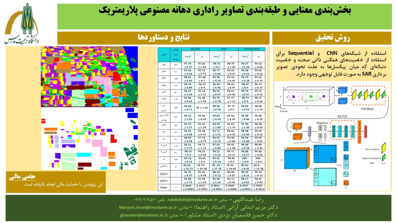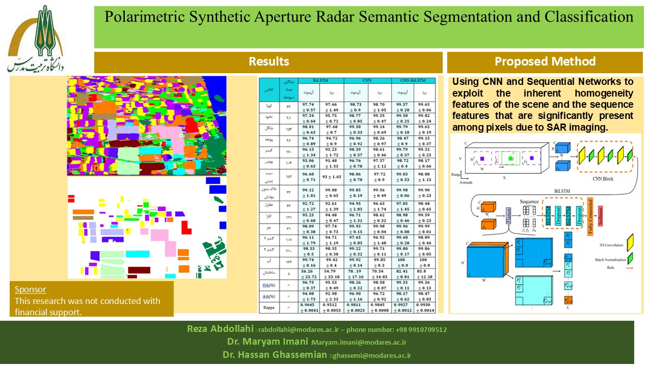 چکیده: سنجش از دور به معنای سنجش سطح زمین از فضا با استفاده از خواص امواج الکترومغناطیس ساطع شده، بازتاب شده یا پراش شده توسط اجسام مورد سنجش به منظور بهبود مدیریت منابع طبیعی، کاربری زمین و حفاظت از محیط زیست است. SAR یک روش تصویر برداری فعال مبتنی بر مایکروویو است که در سکوی‌ های متحرک مانند هواپیما یا ماهواره استفاده می‌ شود. وقتی از فعال صحبت می‌ شود منظور این است که سنجنده به منبع انرژی خود برای تابش به ناحیه، مجهز است. این امکان وجود دارد که طول موج ارسالی را به نحوی انتخاب کرد که بتوان تضعیف امواج الکترومغناطیس ناشی از جو را نادیده گرفت. بنابراین سنجنده SAR می‌ تواند تقریبا تحت هر شرایط آب و هوایی کار کند، و این یکی از مزیت‌ های اصلی این سنجنده نسبت به سایر روش‌ های سنجش از دور در این حوزه می‌ باشد. با توجه به گستردگی سنجنده‌ های PolSAR و قابلیت‌ های آنان مانند تصویربرداری در شب و روز و در شرایط آب و هوایی مختلف و همچنین با توجه به حجم داده‌ ای که تولید می‌ کنند و اطلاعات مفیدی که در زمینه‌ های مختلف به محققان ارائه می‌ دهند، نیاز به پردازش خودکار و استناج از آن‌ ها در سال‌ ها قبل احساس شده و تا به امروز محققان بسیاری از زوایای مختلفی بر روی این نوع از داده‌ ها به پژوهش پرداخته‌ اند. با توجه به قابلیت‌ های روش‌ های یادگیری عمیق، همانند استنتاج و استخراج ویژگی به صورت یکپارچه، و همچنین ظرفیت‌ هایی که از خود در حوزه‌ های مختلف نشان داده‌ اند، استفاده و بررسی آن‌ ها در سال‌ های اخیر به شدت افزایش یافته است. از چالش‌ های اصلی این نوع از روش‌ ها که به صورت تحت نظارت آموزش می‌ بینند و به نسبت روش‌ های ستنی‌ تر یادگیری ماشین به نمونه‌ های آموزشی بیش‌ تری نیاز دارند، کمبود نمونه‌ های آموزشی به علت زمان‌ بر و هزینه‌ بر بودن تهیه‌ ی برچسب برای داده‌ ‌ ی مورد نظر می‌ باشد. از طرف دیگر یکی از چالش‌ های خاص داده‌ ی PolSAR وجود نویز Speckle است. در بسیاری از روش‌ های طبقه‌ بندی تصاویر از همگنی نواحی کمک گرفته می‌ شود، مانند استفاده از شبکه کانولوشنی. که این همگنی در ذات صحنه‌ ی مورد سنجش ما وجود دارد و این مساله مستقل از نحوه اکتساب تصویر می‌ باشد. نکته قابل توجه این است که بسیاری از این روش‌ ها به داده‌ ‌ ی PolSAR صرفا از منظر تصویر توجه می‌ کنند، مگر در پژوهش‌ هایی که بر استخراج ویژگی به خصوص از منظر فیزیکی توجه دارند، مانند روش‌ های تجزیه‌ ای که به طور مختصری در فصل یک و دو به آن‌ ها اشاره شد، اما در SAR جدای از ویژگی‌ های متفاوتی که می‌ تواند بیان کند، به خصوص از منظر فرکانسی، نحوه اکتساب و تشکیل تصویر آن متفاوت است. در این پژوهش سعی شده است تا با استفاده از نحوه‌ ی تصویربرداری این نوع از سنجنده‌ ها و در نظر گرفتن وجود خاصیت دنباله‌ ای در این نوع از داده‌ ها، با بهره‌ گیری همزمان از خاصیت یکپارچگی صحنه و بافت توسط CNN از خاصیت دنباله‌ ای نیز با کمک BiLSTM استفاده شود. برای بررسی عملکرد روش پیشنهادی از سه معیار صحت کل، میانگین صحت کلاس‌ ها و ضریب کاپا و همچنین مقایسه کیفی نتایج بر روی چهار مجموعه داده استفاده شده است. نتایج حاصله نشان می‌ دهد روش پیشنهادی مقاومت بیش‌ تری به نویز دارد و توانسته با تعداد کمی از نمونه‌ های آموزشی به نتایج امیدوار کننده‌ ای دست یابد و سازگاری فضایی مطلوبی را ایجاد کند.