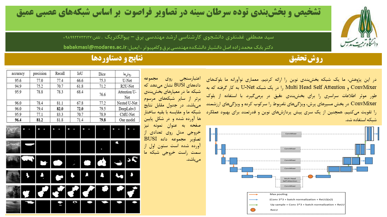 چکیده: بخش‌ بندی دقیق تصاویر فراصوت برای تشخیص ابتلا به سرطان سینه بسیار حیاتی می‌ باشد و فرصت‌ های مختلفی برای درمان این فراهم می‌ کند. با این حال، برچسب‌ گذاری دستی تصاویر فراصوت بسیار زمان‌ بر است و به اپراتور انسانی وابسته می‌ باشد. این مسئله چالش‌ های جدی را برای تشخیص ایجاد می‌ کند.   با توجه به این موضوع‌ ، سیستم‌ های تشخیص کامپیوتری توسعه پیدا کرده‌ اند که امکان کمک به اپراتور‌ ها در تشخیص و طبقه‌ بندی سرطان سینه را دارا هستند. به طور کلی این سیستم‌ ها دارای مراحل مختلفی هستند که در این میان، ‌ بخش‌ بندی تصویر که توده را از پس‌ زمینه جدا می‌ کند‌ ، مهم‌ ترین بخش محسوب می‌ شود و کلید پردازش‌ های بعدی است و کیفیت تجزیه و تحلیل نهایی را تعیین می‌ کند ما در این مطالعه‌ ، یک شبکه ‌ بخش‌ بندی نوین را ارائه کردیم. این ساختار دقت بخش‌ بندی را در تصاویر فراصوت بهبود می‌ بخشد. معماری نوآورانه و قدرتمند ما بلوک‌ های ConvMixer و Multi Head Self Attention را در انتهای بخش کدگذار شبکه U-Net به کار گرفته که به طور موثر اطلاعات سراسری را برای ‌ بخش‌ بندی دقیق در برمی‌ گیرد. همچنین شبکه ما با استفاده از بلوک‌ ConvMixer در بخش مسیر‌ های پرش، ویژگی‌ های نامربوط را سرکوب کرده و ویژگی‌ های ارزشمند را تقویت می‌ کند. در این ساختار از یک سری پیش پردازش‌ های نوین و قدرتمند برای بهبود عملکرد شبکه وجلوگیری از بیش برازش استفاده شده است. اعتبارسنجی ساختار ما روی مجموعه داده‌ های BUSI نشان می‌ دهد که شبکه ما در معیارهای ‌ بخش‌ بندی برتر از سایر شبکه‌ های پایه در این حوزه و شبکه‌های جدیدتر می‌ باشد. همچنین برابری دقت شبکه روی داده‌های ارزیابی و تست بیانگر عدم وجود بیش برازش وتاییدی بر علمی بودن نتایج ما می‌باشد. ساختار ما در بخش‌ بندی توده‌های خوش‌ خیم بسیار خوب عمل کرده و بهبود قابل توجهی در ‌ بخش‌ بندی توده‌ های بدخیم داشته است که به طور ذاتی چالش بیشتری دارند.