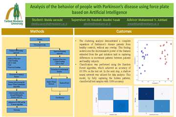 چکیده: بیماری پارکینسون دومین اختلال شایع عصبی است که بیش از شش میلیون نفر در سراسر جهان را درگیر می‌کند و با علائمی نظیر مشکلات راه‌رفتن و اختلالات گفتاری همراه است. تشخیص به‌موقع این بیماری برای مدیریت مؤثر علائم اهمیت بالایی دارد، زیرا علائم اولیه ممکن است مشابه دیگر اختلالات عصبی باشند. هدف این پژوهش، طراحی و پیاده‌سازی یک سیستم مبتنی بر هوش مصنوعی است که با تحلیل داده‌های نیروسنج صفحه‌ای، قادر به شناسایی بیماران پارکینسون از افراد سالم و تسهیل فرایند تشخیص و درمان باشد. برای این منظور، داده‌های حرکتی بیماران با استفاده از نیروسنج صفحه‌ای دو‌بعدی جمع‌آوری شدند و متغیرهای نمایانگر پایداری و عملکرد حرکتی استخراج شدند. داده‌های جمع‌آوری‌شده با بهره‌گیری از الگوریتم‌های یادگیری ماشین پردازش شدند. تحلیل داده‌ها در دو بخش بدون‌نظارت‌ و نظارت‌شده انجام شد. در بخش بدون‌نظارت، پس از انتخاب ویژگی‌های مؤثر با استفاده از الگوریتم بهینه‌سازی نهنگ باینری، کاهش ابعاد با استفاده از روش‌های تحلیل مؤلفه‌های اصلی و فاصله ماهالانوبیس انجام شد. داده‌های کاهش‌یافته با روش t-SNE به فضای دوبعدی نگاشته شدند و خوشه‌بندی آن‌ها با استفاده از الگوریتم K-Means صورت گرفت. نتایج این خوشه‌بندی نشان داد بیماران پارکینسون به‌طور کامل از افراد سالم تفکیک شدند و دقت خوشه‌بندی به 100% رسید. در بخش نظارت‌شده، طبقه‌بندی افراد با استفاده از الگوریتم‌های جنگل تصادفی و شبکه عصبی کم‌عمق انجام شد. مدل جنگل تصادفی در مجموعه داده‌ آموزشی دقت 3/91% و در مجموعه‌داده آزمایشی دقت 33/83% را کسب کرد. تحلیل ماتریس سردرگمی و منحنی ROC، عملکرد مناسب مدل در تفکیک بیماران و افراد سالم‌ را تأیید کرد. شبکه عصبی کم‌عمق، باوجود ساختار ساده، تمامی نمونه‌های مجموعه آزمایشی را به‌درستی طبقه‌بندی کرد. این مدل دقت کامل 100 % به همراه AUC برابر ۱ برای هر دو کلاس به‌دست آورد که نشان‌دهنده توانایی آن در تشخیص نمونه‌ها و یادگیری روابط پیچیده میان ویژگی‌ها بود. نتایج این پژوهش نشان داد که ترکیب الگوریتم‌های خوشه‌بندی و طبقه‌بندی مبتنی بر یادگیری‌ماشین می‌تواند یک چارچوب تحلیلی جامع برای تفکیک و ارزیابی داده‌های حرکتی بیماران پارکینسون فراهم کند. این سیستم می‌تواند به‌عنوان یک ابزار کمک تشخیصی پیشرفته در کلینیک‌ها مورداستفاده قرار گیرد و امکان پایش پیشرفت درمان را نیز فراهم سازد.
