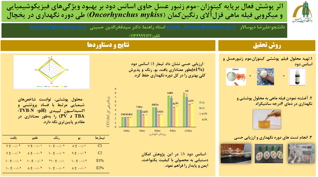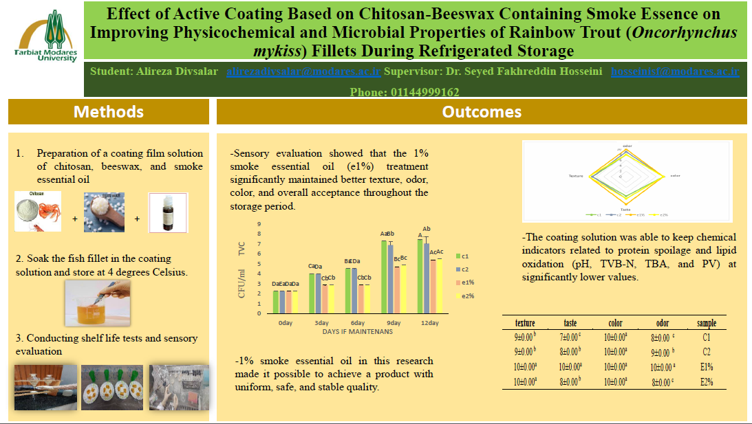 چکیده:قزلآلای رنگینکمان (Oncorhynchus mykiss) بهعنوان یکی از مهمترین و محبوبترین ماهیان پرورشی در جهان، از ارزش اقتصادی و تغذیهای بالایی برخوردار است. با این حال، فساد زودهنگام در طول نگهداری در دمای یخچال، منجر به کاهش کیفیت و ماندگاری این محصول شده و ضایعات قابل توجهی را به صنعت شیلات تحمیل میکند. در این راستا، استفاده از پوششهای فعال خوراکی بر پایه ترکیبات طبیعی بهعنوان رویکردی نوین برای افزایش ماندگاری و حفظ کیفیت مواد غذایی، بهطور فزایندهای مورد توجه قرار گرفته است. پوششهای خوراکی بهدلیل زیستتخریبپذیری، فعالیت ضد میکروبی و آنتیاکسیدانی، و سازگاری با مواد غذایی، مزایای قابل توجهی نسبت به بستهبندیهای مصنوعی دارند. مطالعه حاضر با هدف توسعه و ارزیابی یک پوشش زیستی فعال بر مبنای کیتوزان-موم زنبور عسل حاوی اسانس دود در سطوح 0 (شاهد)، 1 و 2%، جهت بهبود خصوصیات فیزیکوشیمیایی فیله ماهی قزلآلای رنگینکمان طی دوره نگهداری 12 روزه در یخچال طراحی شد. بدین منظور ویژگیهای شیمیایی pH، TVB-N، TBA، PV، میکروبی (TVC) و حسی فیلههای پوشش یافته در فواصل زمانی مختلف (0، 3، 6، 9 و 12 روز) مورد ارزیابی قرار گرفت. نتایج نشان داد که استفاده از پوششهای کیتوزان-موم زنبور عسل حاوی اسانس دود بهطور معناداری (P<0.05) از افزایش pH و مقادیرTVB-N، TBA و PV جلوگیری کرد. همچنین این پوششها باعث کاهش بار میکروبی در مقایسه با نمونههای شاهد شدند، بهطوریکه تیمار حاوی 1 و 2% اسانس دود (e2%) پایینترین مقادیر شاخصهای فساد شیمیایی و میکروبی را در پایان دوره نگهداری نشان داد. ارزیابیهای حسی نیز تأیید کرد که پوششهای فعال بهویژه در سطح 1% اسانس دود، ویژگیهای ارگانولپتیک شامل بافت، بو، رنگ و پذیرش کلی را بهطور قابل توجهی بهبود بخشیدند. بهطور کلی این نتایج بیانگر آن است که پوشش زیستی فعال کیتوزان-موم زنبور عسل حاوی اسانس دود میتواند بهعنوان یک راهکار مؤثر و طبیعی برای افزایش ماندگاری، حفظ کیفیت شیمیایی و میکروبی، و بهبود ویژگیهای حسی فیله ماهی قزلآلای رنگینکمان طی نگهداری سرد مورد استفاده قرار گیرد و جایگزینی مناسب برای روشهای مرسوم محسوب شود.