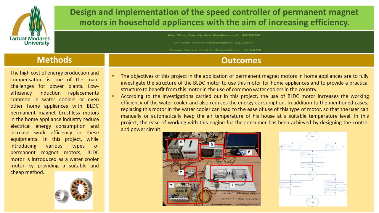 چکیده: هزینه زیاد برای تولید انرژی الکتریکی و جبران کمبود آن‌ ، یکی از چالش‌ های اساسی برای نیروگاه‌ ها به شمار می‌ آید. جایگزینی موتورهای القایی کم‌ بازده رایج در کولرهای آبی و یا حتی دیگر لوازم‌ خانگی با موتورهای بدون جاروبک مغناطیس دائم  (BLDC) در صنعت تولید لوازم‌ خانگی، باعث کاهش مصرف انرژی الکتریکی و افزایش بازدهی کاری، در این تجهیزات می‌ شود. در این پروژه ضمن معرفی انواع موتورهای مغناطیس دائم، با ارائه یک روش مناسب و ارزان‌ قیمت، موتور BLDC، به‌ عنوان موتور کولرآبی معرفی‌ می‌ شود. در کاربرد کولرآبی، موضوع کنترل سرعت، تحت بار مکانیکی در نرم‌ افزار MATLAB Simulink با روش کنترل ذوزنقه‌ ای (هدایت ۱۲۰ درجه) و با استفاده از بهینه‌ ساز جریان لینک DC، شبیه‌ سازی و نتیجه‌ گیری به‌ عمل می‌ آید. بهینه‌ ساز جریان لینک DC به‌ عنوان بلوک کد نویسی شده‌ در بخش شبیه‌ سازی، نقش مهمی را در کنترل دقیق سرعت موتور بر عهده دارد. بهینه‌ ساز جریان لینک DC، مقادیر منفی جریان و دیگر شکل موج‌ های ناخواسته را حذف می‎ کند. به همین علت در قسمت تولید موج  PWM  مقدار سیگنال کنترل از مقدار تعیین‌ شده برای مقایسه با موج دندان‌ اره‌ ای، بالاتر نمی‎ رود. همچنین ضمن پیاده‌ سازی یک نمونه آزمایشگاهی جهت راستی‌ آزمایی عملی سیستم کنترل محرکه شبیه‌ سازی‌ شده، نتایج آن نیز مورد ارزیابی قرار می‌ گیرد. روش کنترلی مورداستفاده در این پروژه، بر اساس کنترل حلقه بسته (کنترل‌ کننده PI) است. استفاده از برد آردوینو یونو، مبتنی بر پردازنده AVR، برای پیدا سازی کنترل کننده PI، به دلیل قابلیت اطمینان زیاد و به‌ صرفه‌ بودن ازلحاظ قیمت برای مصرف‌ کننده، در این پروژه بهره‌ گرفته می‌ شود. مصرف‌ کننده به کمک برد کنترلی موتور، قادر به کنترل سرعت موتور به‌ صورت دستی توسط ولوم تعبیه‌ شده و با استفاده از استراتژی کنترل پهنای پالس (PWM) می‌ باشد و این امر، تغییر سرعت مرجع موتور را ممکن می‌ سازد و درنتیجه باعث تغییر سرعت موردنظر برای دمیده شدن باد به داخل خانه می‌ شود. امکان تنظیم دمای خانه به کمک حسگر دما نیز به‌ صورت خودکار در نظر گرفته می‌ شود، به‌ طوری‌ که سرعت دمیدن باد به داخل خانه توسط حسگر دما قابل‌ تعیین است.
