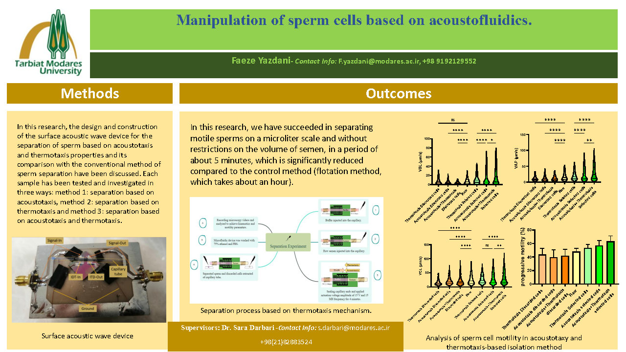 چکیده: معرفی فناوری امواج صوتی سطحی (SAW) در قالب آزمایشگاه روی تراشه مرز جدیدی را در میکروسیالات باز کرده است. مزایای ارائه شده توسط میکروسیالات   SAW شامل ساخت ساده، زیست سازگاری بالا، اعمال نیرو صوتی به ذرات زیرمیلی‌ متری، دست‌ ورزی ذرات بدون نیاز به برچسب گذاری و تماس، تطبیق پذیری، حجم کم، دستگاه‌ها و لوازم جانبی ارزان قیمت می‌باشد. در این پژوهش به طراحی و ساخت افزاره موج صوتی سطحی به منظور جداسازی اسپرم مبتنی بر خاصیت آکوستوتاکسی و ترموتاکسی و مقایسه آن با روش مرسوم جداسازی اسپرم پرداخته شده است. هر نمونه به سه روش: روش ۱: جداسازی مبتنی بر آکوستوتکسی، روش ۲: جداسازی مبتنی بر ترموتاکسی و  روش ۳: جداسازی مبتنی بر آکوستوتکسی وترموتاکسی، مورد آزمایش و بررسی قرار گرفته است. با بررسی نتایج، اسپرم‌ های جداسازی شده به روش جداسازی مبتنی بر آکوستوتکسی وترموتاکسی نسبت به دو روش جداسازی دیگر، مشخصه‌ های تحرک بالاتری دارند، به نحوی که باعث  افزایش ۲۶٪ در VCL، ٪۱۸۵ در VSL، ٪۶۶ در VAP و ۴/۳۵٪ در LIN نمونه انتخابی نسبت به نمونه پردازش نشده، شده است. قابل ذکر است مطابق با بررسی‌ های انجام شده، فرایند جداسازی منجر به اثر مخرب در زنده‌ مانی و یکپارچگی DNA سلول‌ های اسپرم نشده است. همچنین روش جداسازی مبتنی بر آکوستوتکسی وترموتاکسی، به عنوان روش موفق‌ تر در جداسازی اسپرم‌ های متحرک با روش کنترل (شناوری) مورد مقایسه قرار گرفته‌ اند.