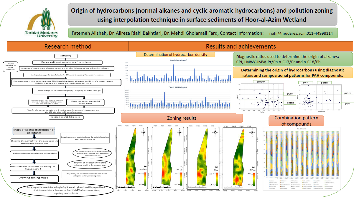 عنوان پایان نامه: منشایابی هیدروکربن ها (آلکان های نرمال وهیدروکربن های آروماتیک حلقوی) و پهنه بندی آلودگی با استفاده از تکنیک درون یابی در رسوبات سطحی تالاب هورالعظیم