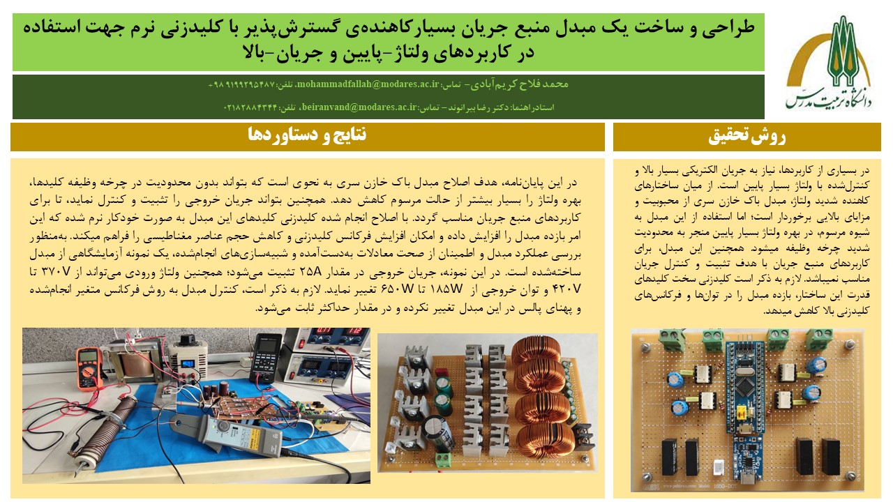 عنوان پایان‌نامه: طراحی و ساخت یک مبدل منبع جریان بسیارکاهنده‌ی گسترش‌پذیر با کلیدزنی نرم جهت استفاده در کاربردهای ولتاژ-پایین و جریان-بالا