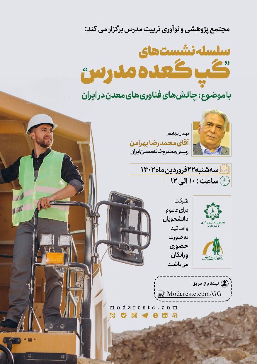 این نشست باحضورمحمد رضا بهرامن رئیس خانه معدن ایران روز سه شنبه ۲۲ فروردین ماه از ساعت ۱۰  تا ۱۲ در سالن جلسات دانشکده فنی و مهندسی دانشگاه تربیت مدرس برگزار می‌شود. شرکت در این نشست برای عموم دانشجویان و اساتید به صورت رایگان است. ثبت نام از طریق: modarestc. com/ggپاسخگویی به سوالات از طریق نشانی: ‏ MTC@modares. ac. ir