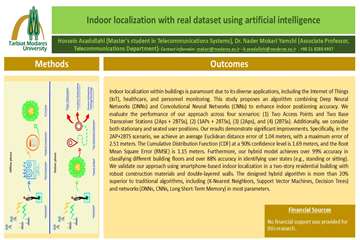 چکیده: باتوجه به اینکه مکان یابی داخل ساختمان از اهمیت بالایی برخوردار است و کاربردهای متنوعی از جمله در حوزه اینترنت اشیا، سلامت و بهداشت و کنترل پرسنل دارد. ما در این پژوهش الگوریتمی از ترکیب شبکه های عصبی عمیق و شبکه های کانولوشن طراحی کرده ایم و عملکرد مکان یابی داخلی را در چهار سناریو شامل (۲ اکسس پوینت+2 ایستگاه فرستنده/گیرنده پایه، ۲ اکسس پوینت+1 ایستگاه فرستنده/گیرنده پایه، ۲ اکسس پوینت، 2 ایستگاه فرستنده/گیرنده پایه) و در دو حالت (ایستاده و نشسته) بررسی نمودیم. نتایج بسیار مطلوبی حاصل گردید که در سناریو اول، میانگین خطای فاصله اقلیدسی ۱.۰۴ متر، ماکزیمم خطا ۲.۵۱ متر، مقدار تابع توزیع تجمعی در ۹۰ درصد ۱.۶۹ متر و مقدار جذر میانگین مربعات خطا ۱.۱۵ متر می باشد. هم چنین قابلیت تشخیص طبقات بالای ۹۹ درصد و تشخیص حالت کاربر بالای ۸۸ درصد است. مکان یابی با استفاده از گوشی هوشمند در یک منطقه مسکونی شهری در ساختمانی دوطبقه با مصالح مستحکم و دیوارهای دوجداره انجام گرفته است. الگوریتم ترکیبی طراحی شده نسبت به الگوریتم های سنتی شامل (K-نزدیک ترین همسایه، ماشین بردار پشتیبان، درخت تصمیم) و شبکه عصبی عمیق، شبکه عصبی کانولوشن و شبکه عصبی حافظه طولانی-کوتاه مدت، در اکثر پارامترها بالای ۲۰ درصد برتری دارد.