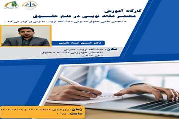 انجمن علمی حقوق عمومی دانشگاه تربیت مدرس کارگاه آموزش مقاله نویسی در علم حقوق را با سخنرانی دکتر حسین آئینه نگینی طی روزهای ۲۴ مهر و ۸ ابان سال جاری از ساعت ۸ تا ۱۰ در سالن عدالت دانشکده حقوق برگزار می‌کند.