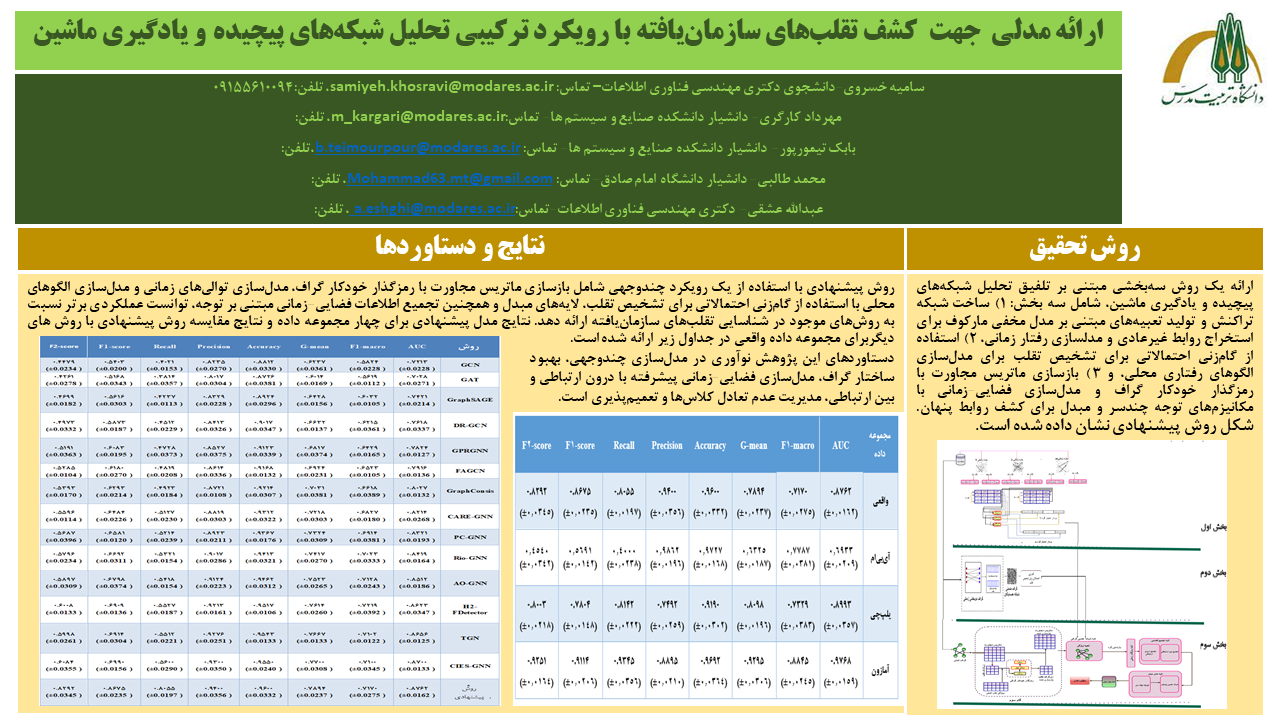 چکیده:تقلب‌های سازمان‌یافته با بهره‌گیری از خدمات مالی متداول و مبتنی بر اینترنت، به‌طور مداوم الگوهای خود را تغییر داده و پیچیده‌تر می‌کنند تا از شناسایی توسط سیستم‌های مبارزه با تقلب فرار کنند. این فعالیت‌های مجرمانه، که اغلب از طریق شبکه‌های گروهی توسعه می‌یابند، به‌صورت پویا تحول می‌یابند و با تقلید رفتارهای خوش‌نیت در حجم انبوه تراکنش‌های عادی پنهان می‌شوند. این رفتارها، همراه با درگیری طرف‌های متعدد و انجام تقلب در بازه‌های زمانی کوتاه، شناسایی را به چالشی پیچیده تبدیل کرده‌است، زیرا بررسی جداگانه موجودیت‌ها و ویژگی‌های تراکنش ممکن است آن‌ها را غیرمشکوک جلوه دهد. برای غلبه بر این چالش‌ها، این پژوهش روشی نوین و سه‌بخشی مبتنی بر تلفیق تحلیل شبکه‌های پیچیده و یادگیری ماشین برای شناسایی تقلب‌های سازمان‌یافته ارائه می‌دهد. در بخش نخست، شبکه تراکنش‌ها ساخته شده و با استفاده از ویژگی‌های شبکه‌ای، تعبیه‌های مبتنی بر مدل مخفی مارکوف تولید می‌شوند تا روابط غیرعادی بین موجودیت‌ها استخراج گردد. در بخش دوم، با بهره‌گیری از گام­زنی احتمالاتی برای تشخیص تقلب، تعبیه‌هایی تولید می‌شود که الگوهای رفتاری محلی و پنهان را مدل‌سازی می‌کنند. در بخش سوم، با بازسازی ماتریس مجاورت، تولید تعبیه‌های شبکه پیچشی گرافی و ترکیب آن‌ها از طریق مکانیزم‌های توجه فضایی و زمانی، مدلی طراحی می‌شود که اطلاعات محلی و جهانی را به‌طور هم‌زمان تجمیع می‌کند. این رویکرد، با مدل‌سازی توالی‌های رفتاری و مدیریت پیچیدگی‌های ساختاری و زمانی، توانایی شناسایی دقیق‌تر تقلب‌ها را فراهم می‌آورد. ارزیابی‌های انجام‌شده بر روی داده‌های واقعی بانکی و مجموعه‌داده‌های استاندارد (مانند یلپ‌چی وآمازون نشان‌دهنده برتری این روش در معیارهایی نظیر مساحت زیرمنحنی، معیار اف­وان و نرخ بازخوانی نسبت به روش‌های پایه و پیشرفته است. این دستاوردها تأیید می‌کنند که ترکیب چندوجهی ویژگی‌ها و مدل‌سازی فضایی-زمانی می‌تواند به‌طور مؤثری الگوهای پنهان تقلب را کشف کرده و راه را برای توسعه سیستم‌های پیشرفته تشخیص تقلب هموار سازد.