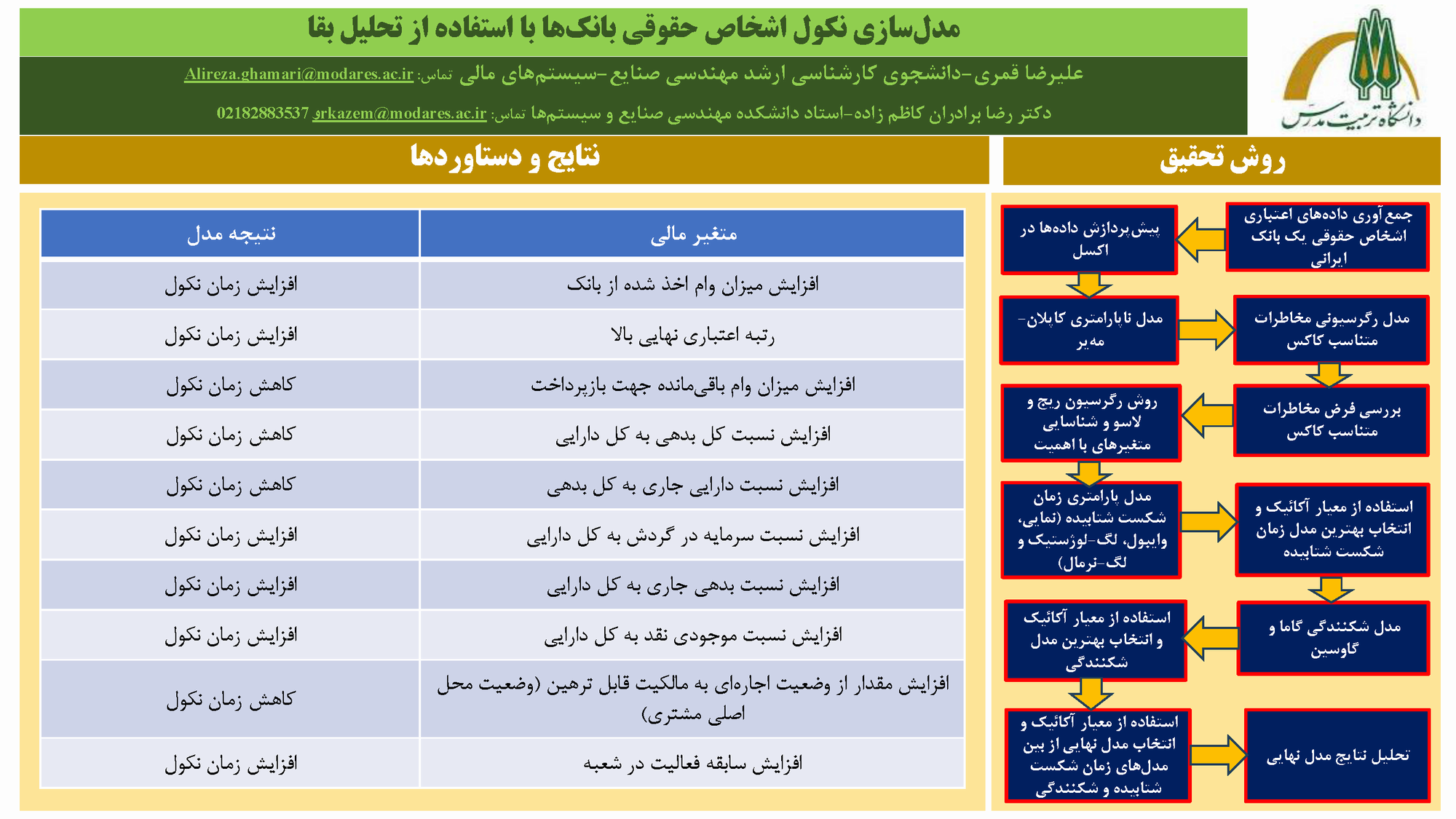 چکیده:در چشم‌انداز رقابتی و پرچالش صنعت بانکداری، مدیریت ریسک اعتباری، به‌ویژه در حوزه اشخاص حقوقی، نقشی اساسی در حفظ ثبات مالی و بهینه‌سازی فرآیندهای اعطای تسهیلات دارد. این پژوهش با هدف تحلیل نکول اعتباری اشخاص حقوقی در یک بانک ایرانی، از روش‌های تحلیل بقا بهره گرفته است تا الگوهای رفتار اعتباری این گروه از مشتریان را شناسایی کرده و عوامل تأثیرگذار بر زمان نکول را مدل‌سازی کند. در گام نخست، داده‌های اعتباری اشخاص حقوقی گردآوری شده و سپس تابع بقا با استفاده از مدل کاپلان-مه‌یر برآورد شد تا توزیع زمان نکول بررسی شود. سپس، مدل رگرسیون مخاطرات متناسب کاکس اجرا شده و فرضیات این مدل ارزیابی گردید. در ادامه، بررسی فرض مخاطرات متناسب کاکس هم در حالت کلی و هم در حضور متغیرهای معنادار مدل انجام شد. برای انتخاب متغیرهای تأثیرگذار، رگرسیون کاکس مبتنی بر تاوان ریج و لاسو به کار گرفته شد و آزمون مخاطرات متناسب بر روی متغیرهای خروجی از رگرسیون کاکس لاسو بررسی گردید. پس از انتخاب متغیرهای کلیدی، مدل‌های زمان شکست شتابیده شامل نمایی، وایبول، لگ-لوژستیک و لگ-نرمال بر داده‌ها اجرا شده و برازش آن‌ها با استفاده از معیار آکائیک (AIC) مقایسه شد که نشان داد مدل لگ-لوژستیک دارای برازش بهتری است. سپس، برای در نظر گرفتن عوامل ناشناخته، مدل‌های شکنندگی نیم‌پارامتری گاما و گاوسین برآورد شدند. آزمون معناداری عامل شکنندگی نشان داد که مدل‌های شکنندگی قادر به بهبود برازش مدل هستند و در مقایسه این مدل‌ها بر اساس معیار آکائیک، مدل شکنندگی گاوسین عملکرد بهتری داشت.  در نهایت، از بین مدل‌های منتخب زمان شکست شتابیده و شکنندگی، مدل زمان شکست شتابیده لگ-لوژستیک به دلیل داشتن مقدار کمتر معیار آکائیک به عنوان مدل برتر انتخاب شد. نتایج این پژوهش نشان می‌دهد که عواملی همچون میزان وام اخذ شده، رتبه اعتباری، مانده وام پرداخت نشده، نسبت کل بدهی به دارایی، نسبت دارایی جاری به کل بدهی، نسبت سرمایه در گردش به کل دارایی، نسبت بدهی جاری به کل دارایی، نسبت موجودی نقد به کل دارایی،  وضعیت محل اصلی مشتری و سابقه فعالیت در شعبه تأثیر معناداری بر زمان نکول دارند. تفسیر ضریب این متغیرها نشان داد که برخی از این عوامل موجب افزایش ریسک نکول شده و برخی دیگر احتمال نکول را کاهش می‌دهند. بر اساس نتایج تحقیق، راهکارهایی برای بهبود مدیریت تسهیلات بانکی ارائه شده است که شامل اصلاح نظام رتبه‌بندی اعتباری، ارزیابی دقیق شاخص‌های نقدینگی و بدهی، و بازنگری در سیاست‌های مرتبط با وثایق و محل فعالیت مشتریان می‌باشد. در نهایت، پیشنهاد شده است که در مطالعات آتی از مدل‌های تحلیل بقای فضایی نیز استفاده شود تا اثرات مکانی و منطقه‌ای بر رفتار نکول اعتباری اشخاص حقوقی مورد بررسی دقیق‌تری قرار گیرد.