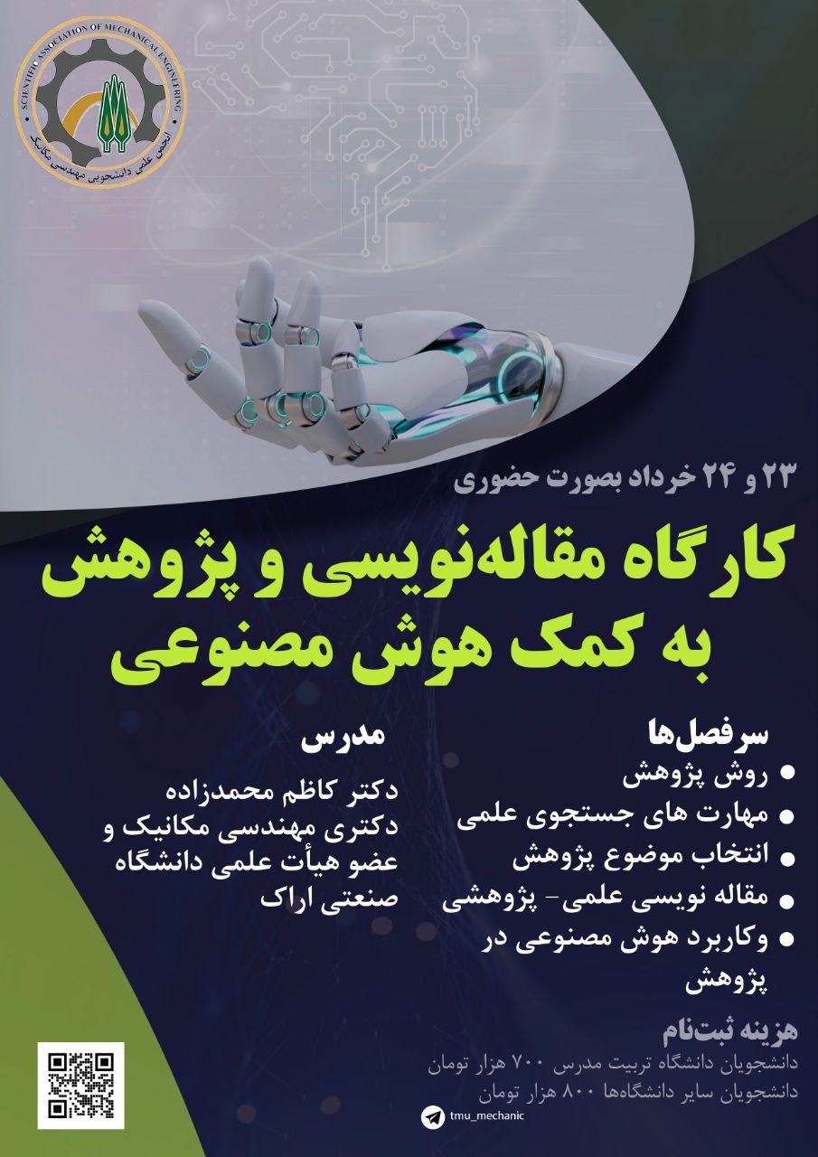 کارگاه «مقالهنویسی و پژوهش همراه با آموزش ابزارهای هوش مصنوعی» 23 و 24 خرداد ماه 1403 در دانشکده مهندسی مکانیک برگزار می شود.