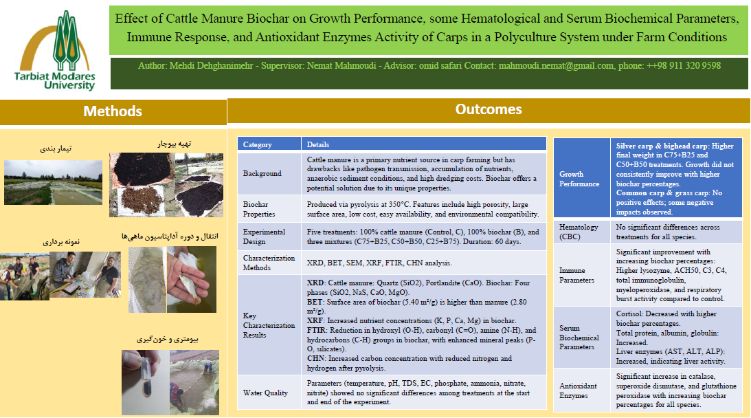 عنوان پایان نامه: اثر بیوچار کود گاوی بر عملکرد رشد و برخی شاخص های هماتولوژی و بیوشیمیایی سرم، پاسخ ایمنی و فعالیت آنزیم های آنتی اکسیدانی کپور ماهیان در سیستم پرورش چندگونه ای در شرایط مزرعه