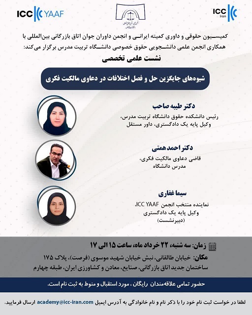 انجمن علمی دانشجویی حقوق خصوصی دانشگاه تربیت مدرس با همکاری کمیسیون حقوقی و داوری کمیته ایرانی و انجمن داوران جوان اتاق بازرگانی بین المللی، نشست علمی-تخصصی « شیوه های جایگزین حل و فصل اختلافات در دعاوی مالکیت فکری» را برگزار می کند. نشست مذکور با حضور و سخنرانی دکتر طیبه صاحب رئیس دانشکده حقوق دانشگاه تربیت مدرس، دکتر احمد همتی قاضی دادگستری و مدرس دانشگاه و سیما غفاری نماینده انجمن ICC YAAF و وکیل دادگستری روز سه شنبه ۲۲ خردادماه جاری از ساعت ۱۵ تا ۱۷ در محل ساختمان جدید اتاق بازرگانی وافع در خیابان طالقانی، نبش خیابان شهید موسوی پلاک ۱۷۵، طبقه چهارم برگزار میشود.