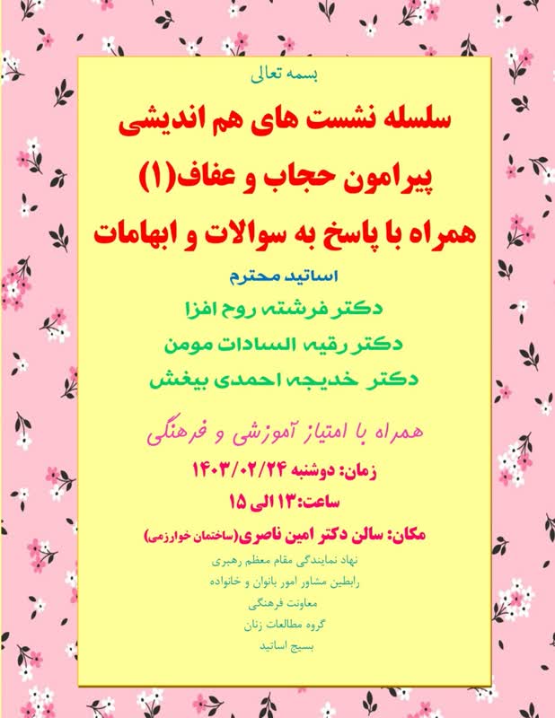 به مناسبت میلاد با سعادت بانوی اسوه حجاب و عفاف، حضرت معصومه (س) و روز دختر نخستین جلسه از سلسله نشستهای هم اندیشی پیرامون حجاب و عفاف، همراه با پاسخ به سؤالات و ابهامات در زمینه حجاب با حضور دکتر فرشته روح افزا استاد و فعال اجتماعی در امور بانوان و خانواده، دکتر رقیه السادات مؤمن و دکتر خدیجه احمدی بیغش اساتید دانشگاه برگزار میشود.