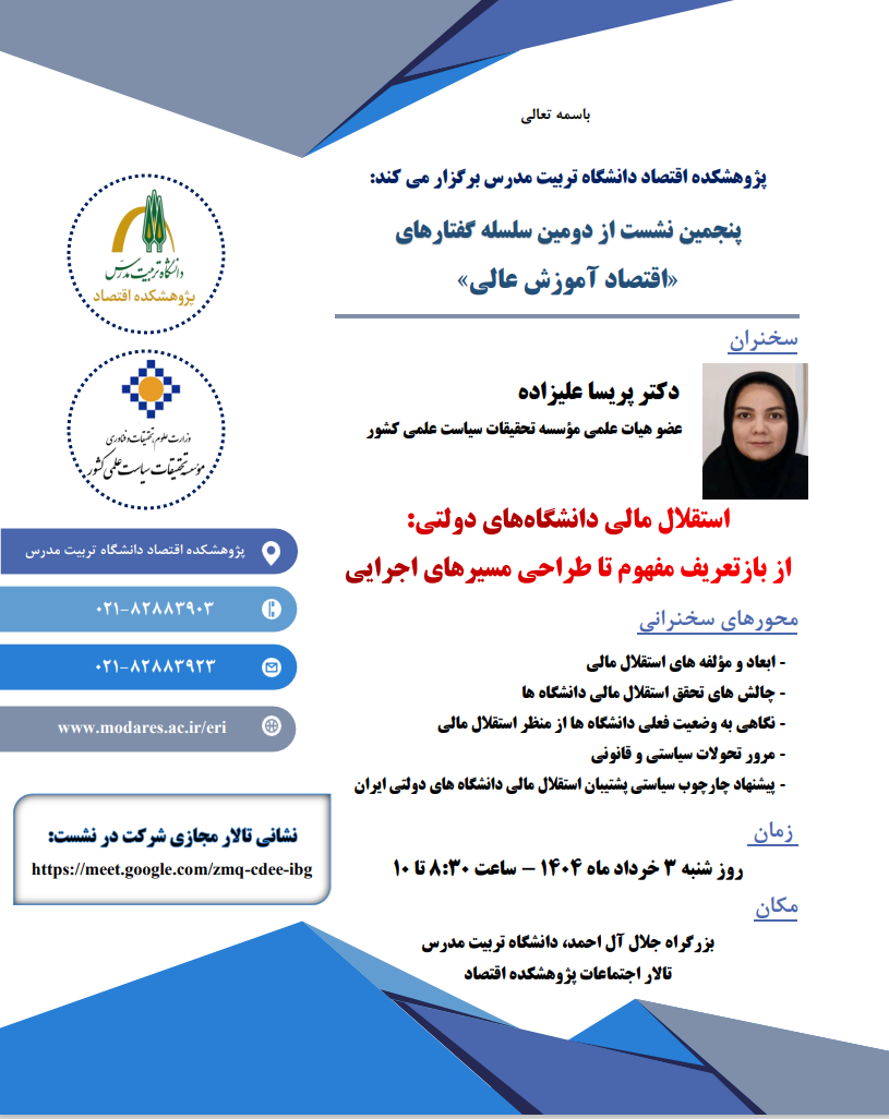 پژوهشکده اقتصاد دانشگاه تربیت مدرس پنجمین نشست از دومین دوره سلسله گفتارهای «اقتصاد آموزش عالی» را با عنوان «استقلال مالی دانشگاه های دولتی: از بازتعریف مفهوم تا طراحی مسیرهای اجرایی» سوم خرداد ۱۴۰۴ برگزار می کند.این نشست تخصصی با سخنرانی دکتر پریسا علیزاده عضو هیأت علمی مؤسسه تحقیقات سیاست علمی کشور حول محورهای: ابعاد و مؤلفه های استقلال مالی، چالش های تحقق استقلال مالی دانشگاه ها، نگاهی به وضعیت فعلی دانشگاه ها از منظر استقلال مالی، مرور تحولات سیاستی و قانونی، پیشنهاد چارچوب سیاستی پشتیبان استقلال مالی دانشگاه های دولتی ایران روز شنبه سوم خرداد از ساعت ۸:۳۰ تا ۱۰ در سالن همایش پژوهشکده اقتصاد دانشگاه تربیت مدرس برگزار می شود.