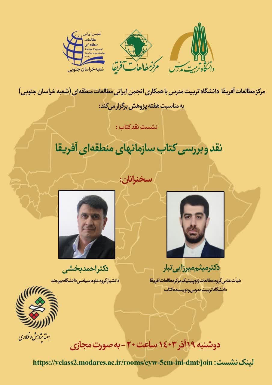 مرکز مطالعات آفریقا دانشگاه تربیت مدرس با همکاری انجمن ایرانی مطالعات منطقه ای شعبه خراسان جنوبی به مناسبت هفته پژوهش نشست نقد و بررسی کتاب سازمان های منطقه ای آفریقا را برگزار میکند.