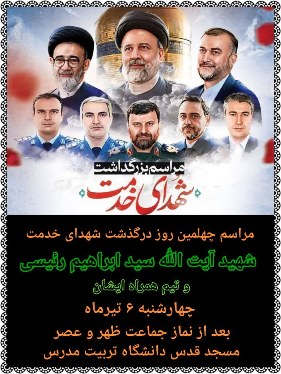مراسم چهلمین روز درگذشت شهید آیت الله سید ابراهیم رئیسی و تیم همراه ایشان همراه با سخنرانی و مداحی روز چهارشنبه ۶ تیرماه بعد از نماز جماعت ظهر و عصر در  مسجد قدس دانشگاه تربیت مدرس برگزار می‌شود.