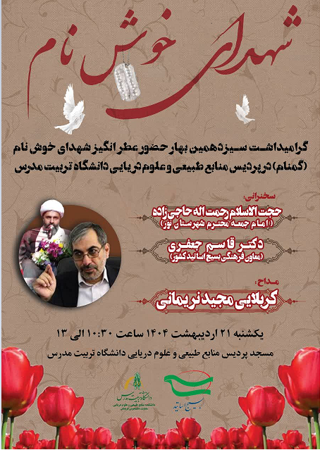 سیزدهمین سالگرد تدفین شهدای خوشنام (گمنام) در پردیس منابع طبیعی و علوم دریایی دانشگاه روز دوشنبه 21 اردیبهشت 1404 با حضور امام جمعه شهرستان نور حجت الاسلام حاجی زاده، معاون فرهنگی بسیج اساتید کشور دکتر قاسم جعفری و دکتر اسماعیلی رئیس دانشکده برگزار شد. در خلال این مراسم که با حضور استادان، کارکنان، دانشجویان دانشکده و مسئولین و کارکنان ادارات شهرستان نور برگزار شد، از مادر شهید مدافع حرم علی جمشیدی تجلیل به عمل آمد. در پایان نیز حضار جهت قرائت فاتحه و اهداء شاخه گل بر مزار شهدا حضور یافتند.