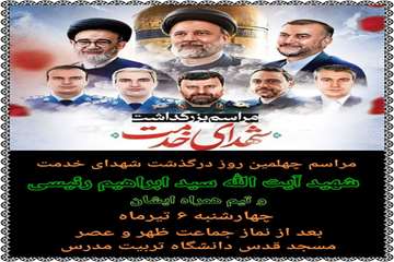 مراسم چهلمین روز درگذشت شهدای خدمت، روز چهارشنبه 6 تیر در مسجد دانشگاه برگزار می شود.