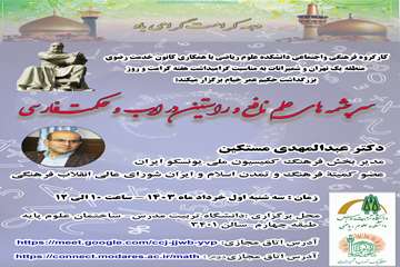 کارگروه فرهنگی و اجتماعی دانشکده علوم ریاضی به مناسبت هفته کرامت و روز بزرگداشت حکیم عمر خیام جلسه سخنرانی با عنوان «سرچشمههای علم نافع و راستین در ادب و حکمت فارسی» را با حضور دکتر عبدالمهدی مستکین مدیر بخش فرهنگ کمیسیون ملی یونسکو ایران و عضو کمیته فرهنگ و تمدن اسلام و ایران شورای عالی انقلاب فرهنگی به صورت حضوری و مجازی برگزار میکند. جلسه مذکور روز سه شنبه اول خرداد ۱۴۰۳ از ساعت ۱۰ تا ۱۲ در سالن ۳۴۰۱ واقع در طبقه چهارم دانشکده علوم پایه برگزار میشود. حضور در جلسه از طریق لینکهای زیر به صورت مجازی میسر است.