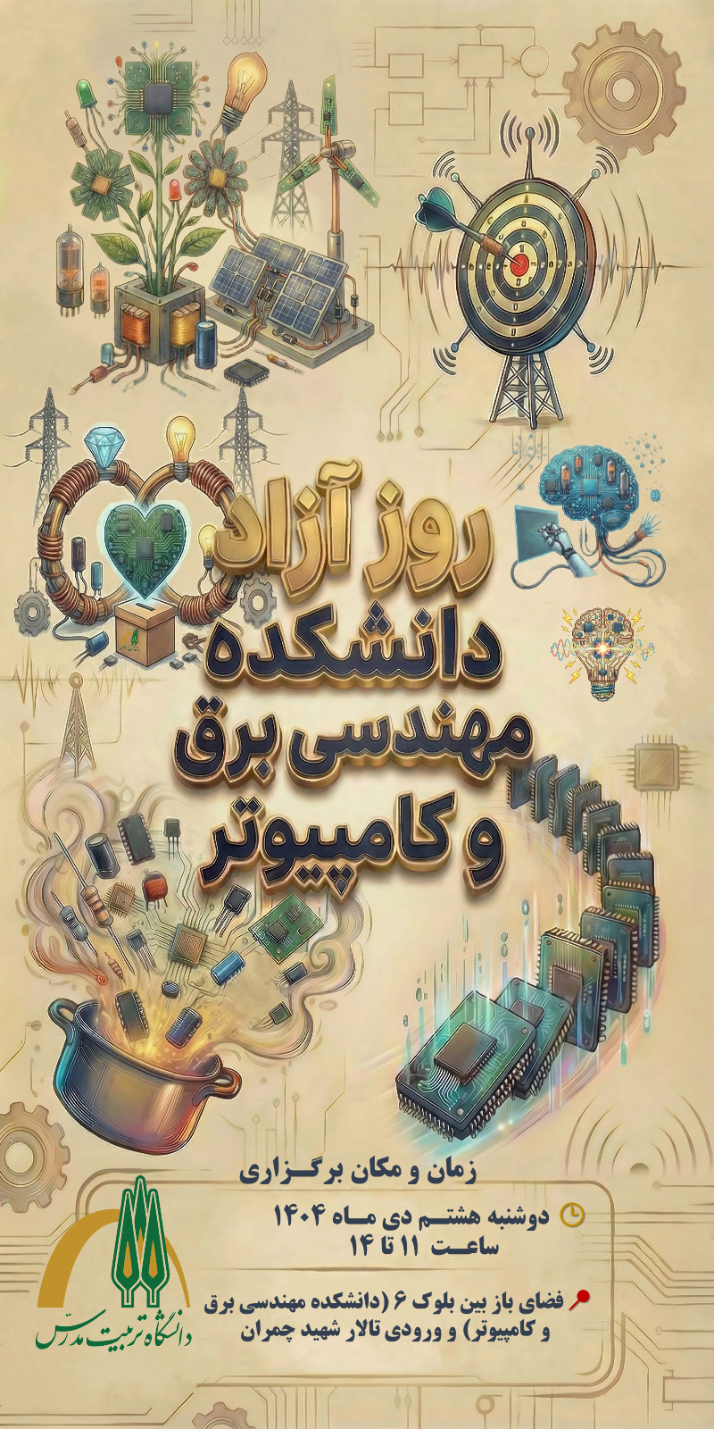 رویداد «روز آزاد دانشکده مهندسی برق و کامپیوتر» هشتم دی ماه ۱۴۰۴ در فضای باز بین بلوک ۶ و ورودی تالار شهید چمران برگزار می شود.