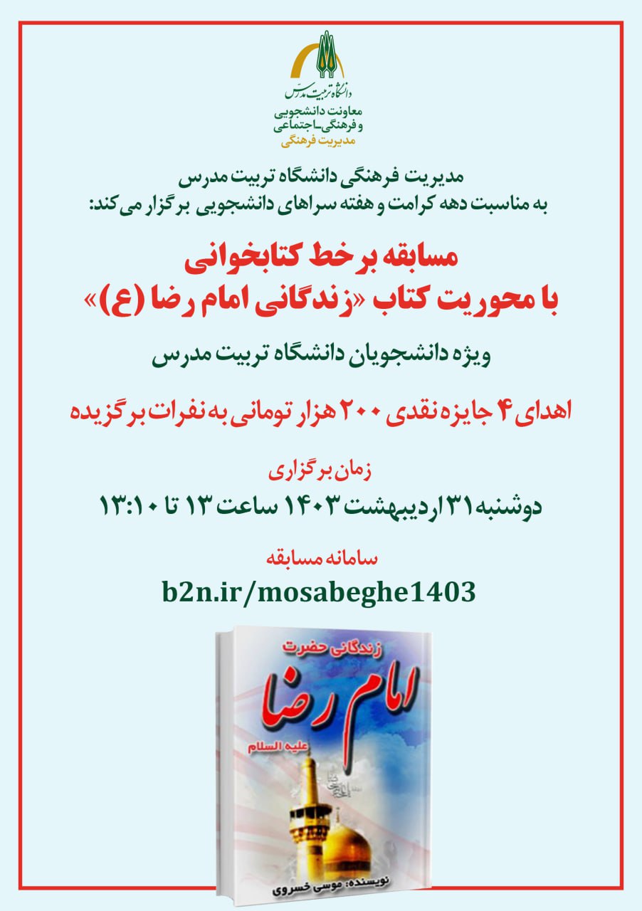 مدیریت فرهنگی دانشگاه تربیت مدرس به مناسبت دهه کرامت و هفته سراهای دانشجویی مسابقه کتابخوانی با محوریت کتاب « زندگانی امام رضا (ع) » را به صورت برخط از طریق سامانه مسابقات فرهنگی دانشگاه برگزار می‌ کند و به ۴ نفر از برگزیدگان جایزه نقدی ۲۰۰ هزار تومانی اهدا خواهد کرد. مسابقه روز دوشنبه ۳۱ اردیبهشت ۱۴۰۳ از ساعت ۱۳ تا  ۱۳:۱۰ در  سامانه مسابقات فرهنگی دانشگاه تربیت مدرس برگزار می‌ شود. کتاب « زندگانی امام رضا (ع) »