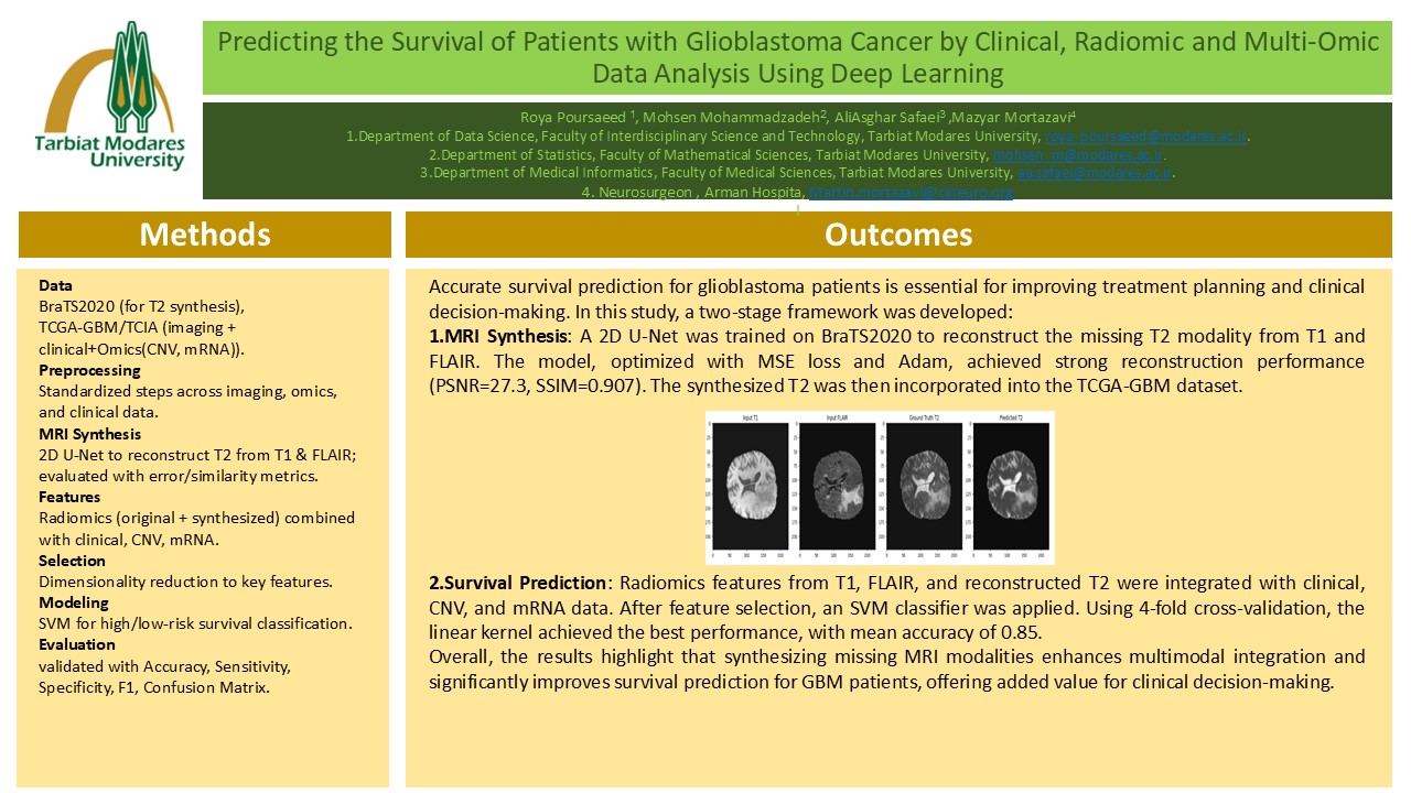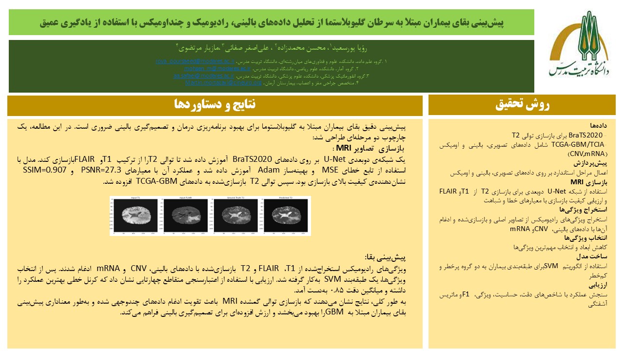 عنوان پایان‌نامه: پیش گویی بقای بیماران مبتلا به سرطان گلیوبلاستوما از تحلیل داده های بالینی، رادیومیک و چنداومیکس با استفاده از یادگیری عمیق