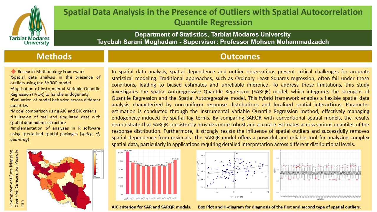 چکیده:در تحلیل آماری داده‌های فضایی، وجود ساختار وابستگی داده‌ها و مشاهدات دورافتاده از جمله چالش‌های اساسی در برازش مدل‌های رگرسیونی است. مدل‌های کلاسیک مانند رگرسیون خطی معمولی در مواجهه با چنین شرایطی معمولاً دچار ضعف در استنتاج و کاهش دقت می‌شوند. در این پژوهش، به منظور بهبود عملکرد مدل‌سازی فضایی در شرایط مذکور، مدل رگرسیون چندکی خودهمبسته فضایی مورد بررسی قرار گرفته است.این مدل با تلفیق رویکرد رگرسیون چندکی و مدل خودهمبسته فضایی، انعطاف‌پذیری لازم برای تحلیل داده‌ها در آن با پراکندگی مقادیر پاسخ و وابستگی فضایی مشهود است. روش استفاده از رگرسیون چندکی با متغیر ابزاری قابل اعتماد نشان می‌دهد که امکان کاهش اثر داده‌های دورافتاده و دستیابی به نتایج دقیق‌تر فراهم می‌شود.همچنین مقایسه این مدل با مدلهای دیگر نشان داده که مدل رگرسیون چندکی خودهمبسته فضایی در سطوح مختلف چندکی دقت و پایداری بیشتری در تحلیل روابط بین متغیرها دارد که تحلیل دقیق‌تری از داده‌های فضایی ارائه می‌دهد. نتایج همچنین نشان‌دهنده بیانگر برتری این مدل در بسیاری از تحلیل داده‌های فضایی مورد نظر می‌باشد.