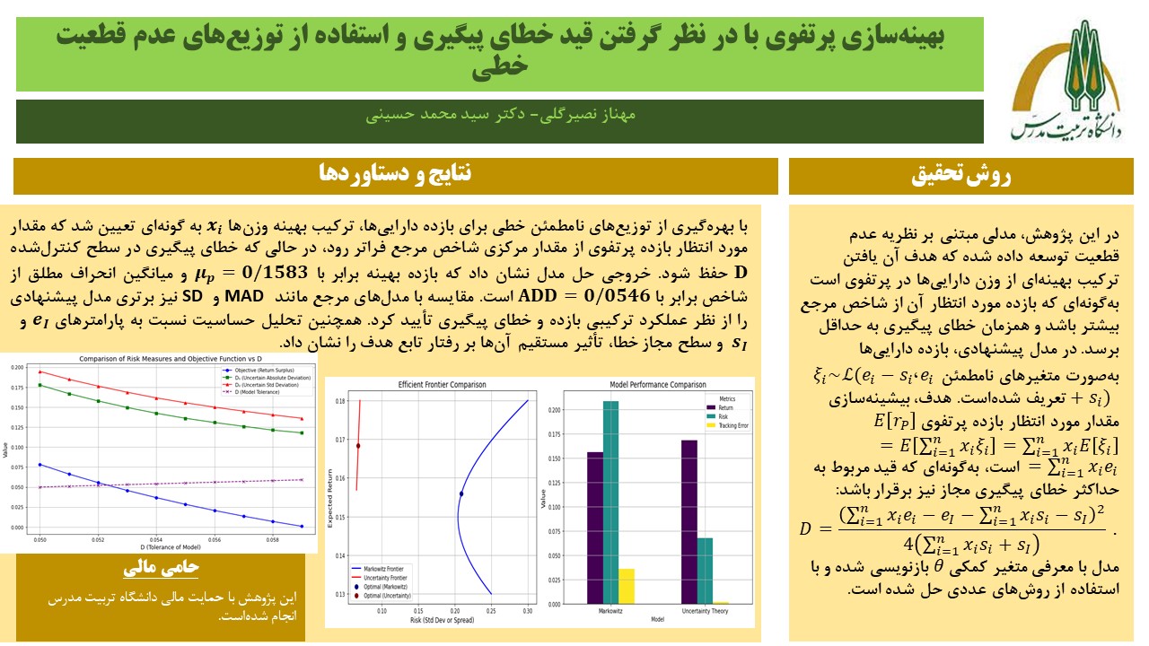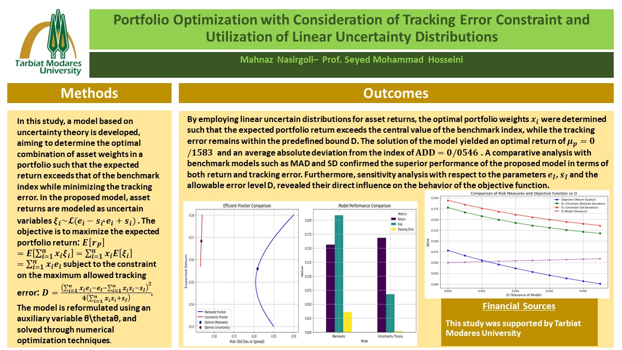 ارائه کننده: مهناز نصیرگلیاستاد راهنما: دکتر سیدمحمد حسینیاستاد داور داخلی: دکتر مجید جعفری خالدیاستاد داور خارج از دانشگاه: دکتر مصطفی شمسینماینده تحصیلات تکمیلی: دکتر مجید جعفری خالدیتاریخ: ۱۴۰۴/۰۳/۱۹ساعت:  13مکان: اتاق شورای ساختمان خوارزمیچکیده:در این پژوهش، مدلی مبتنی بر نظریه عدم قطعیت توسعه داده شده که هدف آن یافتن ترکیب بهینه‌ای از وزن دارایی‌ها در پرتفوی است به‌گونه‌ای که بازده مورد انتظار آن با شاخص مرجع بیشترین نزدیکی را داشته و همزمان خطای پیگیری به حداقل برسد. مدل پیشنهادی از توزیع‌های نامطمئن خطی به صورت متغیرهای نامطمئن استفاده کرده است. سپس ویژگی‌های مشخص برای شناسایی خطاهای پیش‌بینی بررسی شده‌اند.