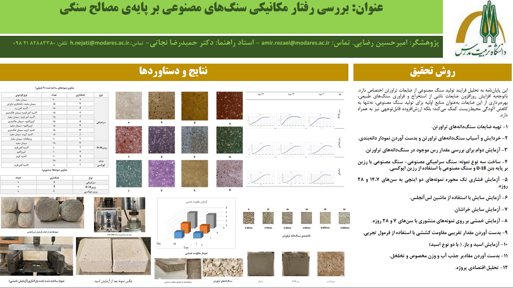 چکیده: در عصر حاضر، تولید سنگ مصنوعی از ضایعات سنگ بری‌ها و معادن به عنوان یک منبع ارزش افزوده قابل توجه شناخته می‌شود. در این راستا، سنگ سرامیکی مصنوعی به عنوان یکی از انواع سنگ‌های مصنوعی، به هر ماده یا ترکیبی از پودر و دانه‌های معدنی اطلاق می‌شود که با استفاده از یک ماده چسبنده باخاصیت سیمانی شکل میگیرد. این ماده چسبنده معمولا از تعامل پودر معدنی چسبنده و سیمان‌های پایه به همراه آب تولید می‌شود. ویژگی اصلی این نوع سنگ، ارزان بودن و در دسترس بودن مواد اولیه آن است که به نوبه خود به گسترش استفاده از آن در پروژه‌های ساختمانی کمک می‌کند. این پایان نامه به تحلیل فرایند تولید سنگ مصنوعی از ضایعات تراورتن اختصاص دارد. با توجه به افزایش روزافزون ضایعات ناشی از استخراج و فراوری سنگ‌های طبیعی، بهره برداری از این ضایعات به عنوان منابع اولیه برای تولید سنگ مصنوعی، نه تنها به کاهش آلودگی محیطزیست کمک می‌کند؛ بلکه ارزش افزوده قابل توجهی نیز به همراه دارد. در این تحقیق، مراحل مختلف تولید سنگ مصنوعی شامل جمع آوری، فراوری و ترکیب ضایعات تراورتن با مواد افزودنی مانند سیمان و انواع رزین‌ها مورد بررسی قرار می‌گیرد. نتایج نشان می‌دهد که با کنترل دقیق نسبت‌های ترکیبی و فرایندهای تولید، می‌توان ویژگی‌های مکانیکی و فیزیکی مطلوبی را در سنگ مصنوعی به دست آورد. همچنین، این نوع سنگ به دلیل قابلیت سفارشی سازی در طراحی و قیمت مناسب، به عنوان مصالح ساختمانی پرکاربرد شناخته میشود. در نهایت، این پایان نامه به ارائه راهکارهایی برای بهینه سازی فرایند تولید سنگ مصنوعی از ضایعات تراورتن و بررسی تأثیرات اقتصادی و زیست محیطی آن می‌پردازد.