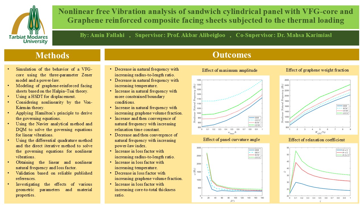 چکیده: در سالهای اخیر مواد ویسکوالاستیک به دلیل میرایی و رفتار دینامیکی متفاوت و همچنین پانل ساندویچی به دلیل کاربرد زیاد در صنایع موردتوجه پژوهشگران قرار گرفته است. در این پژوهش تحلیل ارتعاشات آزاد خطی و غیرخطی پانل استوانهای ساندویچی کامپوزیتی به همراه هسته ویسکوالاستیک مدرج تابعی و رویههای تقویت شده با صفحات گرافن تحت بار حرارتی بررسی خواهند شد؛ پانل استوانهای ساندویچی کامپوزیتی از سهلایه هسته ویسکوالاستیک مدرج تابعی و دولایه بالایی و پایینی تقویت شده با صفحات گرافن تشکیل خواهد شد. همچنین بر اساس مدل سه پارامتری زنر و تئوری هالپین-تسای هسته ویسکوالاستیک و رویهها مدلسازی خواهند شد. در ادامه با استفاده از تئوری برشی مرتبه بالا و تئوری غیرخطی ون- کارمن جابهجایی و کرنشها فرض خواهند شد. با بهکارگیری اصل همیلتون معادلات حاکم استخراج و با استفاده از روش حل مربعات تفاضلی معادلات خطی و نیز معادلات غیرخطی حل خواهند گردید و در ادامه با درنظرگرفتن منابع معتبر موجود معادلات صحت سنجی خواهند شد. همچنین اثر پارامترهای مختلف همچون افزایش دما، شرایط مرزی مختلف، خصوصیات هسته ویسکوالاستیک مدرج تابعی، کسر حجمی صفحات گرافن و ابعاد هندسی بر روی فرکانسهای خطی و غیرخطی مطالعه خواهد شد.