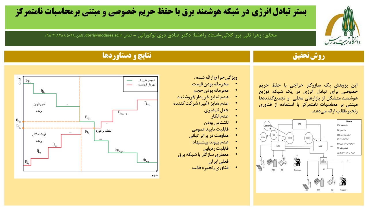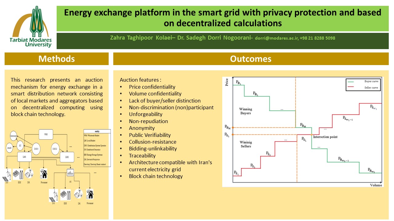 چکیده: پیشرفت فناوری­ های مخابراتی و الکترونیکی و به­ کارگیری این فناوری­ ها در صنعت برق، به پدید آمدن مفهوم شبکه هوشمند انرژی منجر شده است. از مهم­ ترین انگیزه­ های شبکه هوشمند می­ توان به تعدد و تنوع روزافزون منابع تولید و مصرف انرژی و لزوم تحول در ساختار شبکه برق برای پاسخگویی به نیازمندی­ های جدید اشاره کرد. به دلیل ظهور منابع تولید انرژی در شبکه­ های توزیع هوشمند و نزدیک بودن این منابع به مصرف­ کنندگان نهایی، نیاز به ایجاد یک بازار هوشمند به منظور تبادل انرژی تولیدی در گره­ های این شبکه احساس می­ شود. در این پژوهش به منظور پیاده­ سازی تبادل انرژی در شبکه­ های توزیع هوشمند، از یک سازوکار حراجی استفاده می­ شود تا تولیدکنندگان و مصرف­ کنندگان بتوانند با بهینه­ سازی نیازمندی­ های خود، به خرید و فروش انرژی به شکل اقتصادی بپردازند. شرکت در چنین سازوکارهایی می­ تواند حریم خصوصی کاربران را تهدید کند. لذا استفاده از روشی که بتوان حریم خصوصی کاربران را نیز در فرآیند تبادل انرژی در نظر گرفت بسیار مهم می­ باشد. این پژوهش یک سازوکار حراجی برای تبادل انرژی در یک شبکه توزیع هوشمند متشکل از بازارهای محلی و تجمیع­ کننده­ هامبتنی بر محاسبات نامتمرکز با استفاده از فناوری زنجیره­ قالب ارائه می­ دهد که مشارکت ­ کنندگان به عنوان خریدار یا فروشنده در فرآیند حراج شرکت می‌­ کنند و پیشنهادات خرید/فروش خود را به قرارداد هوشمند ارائه می­ دهند، به­ گونه ­ ای که حریم خصوصی کاربران حفظ می­ شود. در سطوح دیگر، کاربران عادی می‌­ توانند در حراج شرکت نکنند و مستقیما با تجمیع­ کننده در ارتباط باشند.